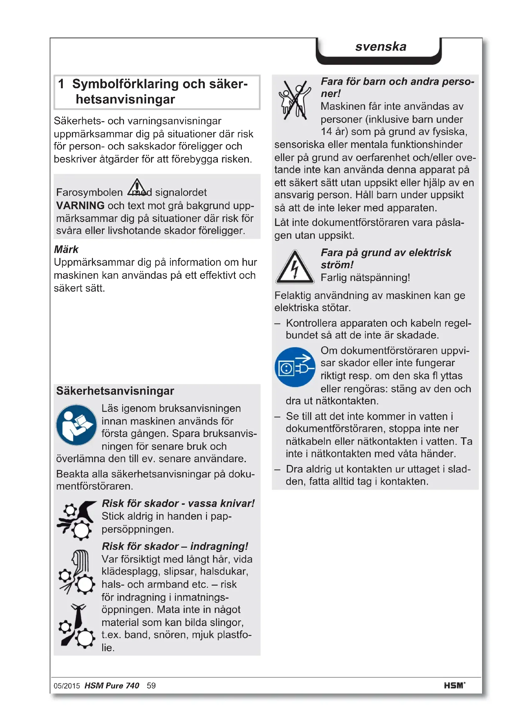 Vægt 50 kg 56 kg Skærehastighed 70 mm/s 60 mm/s Indføringsbredde 400 mm Tilslutning 230 V, 50 Hz 120 V, 60 Hz 220 V, 60 Hz Strømforbrug ved maks. antal ark 590 W Driftsart Konstant drift Omgivelsesbetingelser under driften: Temperatur Relativ luftfugtighed Højde over havets overfl ade -10 °C til +25 °C Maks. 90 %, ikke-kondenserende Maks. 2.000 m Mål B x D x H (mm) 620 x 487 x 889 Volumen på affaldsbeholderen 145 l Emissionslydtrykniveau (tomgang / last) 56 dB(A) / 59-63 dB(A)05/2015 HSM Pure 740 59 svenska 1 Symbolförklaring och säker- hetsanvisningar Säkerhets- och varningsanvisningar uppmärksammar dig på situationer där risk för person- och sakskador föreligger och beskriver åtgärder för att förebygga risken. Märk Uppmärksammar dig på information om hur maskinen kan användas på ett effektivt och säkert sätt. Farosymbolen med signalordet VARNING och text mot grå bakgrund upp- märksammar dig på situationer där risk för svåra eller livshotande skador föreligger. Säkerhetsanvisningar Läs igenom bruksanvisningen innan maskinen används för första gången. Spara bruksanvis- ningen för senare bruk och överlämna den till ev. senare användare. Beakta alla säkerhetsanvisningar på doku- mentförstöraren. Risk för skador - vassa knivar! Stick aldrig in handen i pap- persöppningen. Risk för skador – indragning! Var försiktigt med långt hår, vida klädesplagg, slipsar, halsdukar, hals- och armband etc. – risk för indragning i inmatnings- öppningen. Mata inte in något material som kan bilda slingor, t.ex. band, snören, mjuk plastfo- lie. Fara för barn och andra perso- ner! Maskinen får inte användas av personer (inklusive barn under 14 år) som på grund av fysiska, sensoriska eller mentala funktionshinder eller på grund av oerfarenhet och/eller ove- tande inte kan använda denna apparat på ett säkert sätt utan uppsikt eller hjälp av en ansvarig person. Håll barn under uppsikt så att de inte leker med apparaten. Låt inte dokumentförstöraren vara påsla- gen utan uppsikt. Fara på grund av elektrisk ström! Farlig nätspänning! Felaktig användning av maskinen kan ge elektriska stötar. – Kontrollera apparaten och kabeln regel- bundet så att de inte är skadade. Om dokumentförstöraren uppvi- sar skador eller inte fungerar riktigt resp. om den ska fl yttas eller rengöras: stäng av den och dra ut nätkontakten. – Se till att det inte kommer in vatten i dokumentförstöraren, stoppa inte ner nätkabeln eller nätkontakten i vatten. Ta inte i nätkontakten med våta händer. – Dra aldrig ut kontakten ur uttaget i slad- den, fatta alltid tag i kontakten.60 HSM Pure 740 05/2015 svenska 2 Ändamålsenlig användning, garanti Dokumentförstöraren har 2 års garanti. Oberoende av garantin fi nns det en garanti för HSM dokumentförstörarens stål-kni- vaxlar som gäller under hela apparatens livstid (HSM Lifetime Warranty). Garantin gäller inte för slitage, skador p.g.a. felaktig användning eller obehörigt ingrepp. HSM tillhandahåller reservdelar upp till 10 år efter att denna modell har slutat tillver- kas. Dokumentförstöraren är avsedd att använ- das för förstöring av papper, mindre mängder CD-/DVD-skivor och kredit-/kund- kort. Det robusta skärverket skadas inte av häft- klammer eller gem. Manöver- och displayelement Symboler Behållare full Symboler Driftklar Symboler Skärverket blockerat Lucka öppen / Aktiverad säkerhetsdel Manöverknapp Reverseringsknapp 3 Översikt 1 Lucka 2 Säkerhetsanvisningar 3 Fotocell 4 Manöver- och displayenhet 5 Säkerhetsdel 6 Typskylt 7 Nätbrytare 1 2 3 4 5 6 705/2015 HSM Pure 740 61 svenska 4 Idrifttagande VARNING Farlig nätspänning! Felaktig användning av maskinen kan ge elektriska stötar. – Använd endast apparaten inomhus i torra rum. Slå aldrig på den i fuktiga rum eller i regn. – Låt inte apparaten, nätkontakten och nätkabeln komma nära öppen eld och heta ytor. Luftspringorna får inte täckas över, dokumentförstörarens avstånd till väggen eller till möbler måste vara minst 5 cm. – Se till att nätkontakten är lätt åtkomlig. – Kontrollera att strömnätets spänningoch frekvens stämmer överens med uppgif- terna på typskylten innan nätkontakten ansluts.