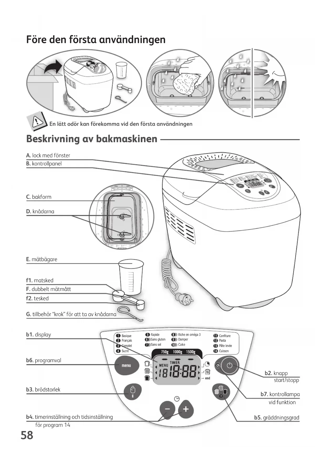 TEFAL-OW5000-NC00017447_TEFAL-OW5000-NC00017447 26/07/10 10:16 Page57Basique Français Complet Rapide Sans gluten Sans sel Riche en oméga 3 Damper Cake Sucré Confiture Pasta Pâte levée Cuisson Före den första användningen Bas iqueFran çai sCom pletRap ideSan s gl utenSan s se lRic he e n om éga 3Dam perCak eSCon fitu rePast aPât e le véeC En lätt odör kan förekomma vid den första användningen Beskrivning av bakmaskinen A. lock med fönster B. kontrollpanel f2. tesked b1. display b2. knapp start/stopp b7. kontrollampa vid funktion b5. gräddningsgrad F. dubbelt mätmått f1. matsked C. bakform G. tillbehör “krok” för att ta av knådarna E. mätbägare b6. programval b3. brödstorlek b4. timerinställning och tidsinställning för program 14 D. knådarna