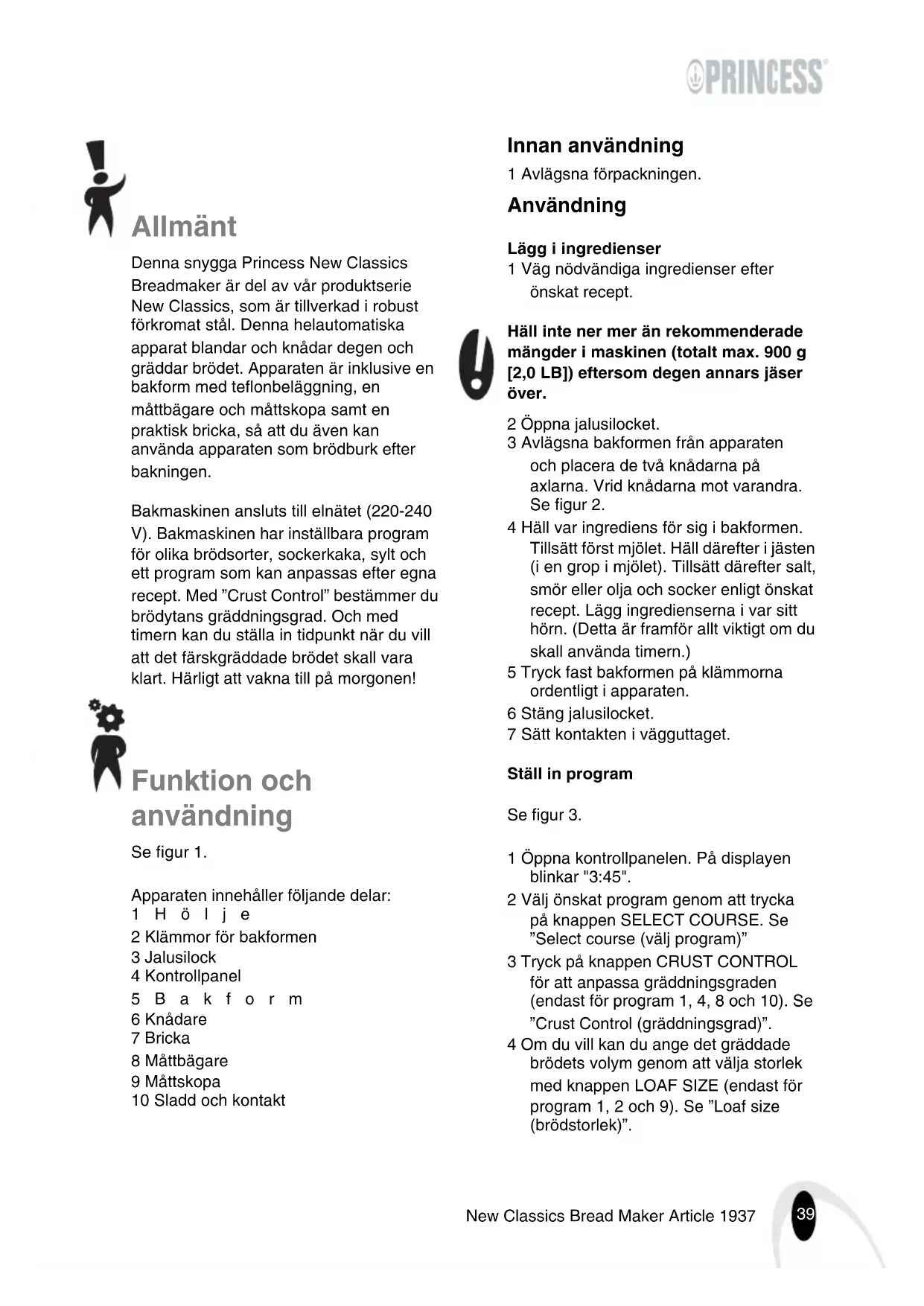 - Dopo l’uso, pulire sempre a fondo l’apparecchio (vedere la sezione “Pulizia e manutenzione”).38 New Classics Bread Maker Article 1937 Tutela dell’ambiente Gettare il materiale di imballaggio, come plastica e cartone, negli appositi contenitori. Se volete smaltire l'apparecchio, anche se funziona ancora correttamente o può essere riparato facilmente, assicuratevi che venga riutilizzato. Alla fine della durata, l’apparecchio deve essere smaltito in modo responsabile, in modo che l’apparecchio stesso o i suoi componenti possano essere riutilizzati. Non smaltire l'apparecchiatura deponendola assieme ai rifiuti comuni e non differenziati: consegnarla invece al negoziante o presso un punto di raccolta autorizzato. Contattare la propria amministrazione comunale per ulteriori informazioni sulle modalità disponibili di consegna e di raccolta.39 New Classics Bread Maker Article 1937 Allmänt Denna snygga Princess New Classics Breadmaker är del av vår produktserie New Classics, som är tillverkad i robust förkromat stål. Denna helautomatiska apparat blandar och knådar degen och gräddar brödet. Apparaten är inklusive en bakform med teflonbeläggning, en måttbägare och måttskopa samt en praktisk bricka, så att du även kan använda apparaten som brödburk efter bakningen. Bakmaskinen ansluts till elnätet (220-240 V). Bakmaskinen har inställbara program för olika brödsorter, sockerkaka, sylt och ett program som kan anpassas efter egna recept. Med ”Crust Control” bestämmer du brödytans gräddningsgrad. Och med timern kan du ställa in tidpunkt när du vill att det färskgräddade brödet skall vara klart. Härligt att vakna till på morgonen! Funktion och användning Se figur 1. Apparaten innehåller följande delar: 1Hölje 2 Klämmor för bakformen 3 Jalusilock 4 Kontrollpanel 5Bakform 6 Knådare 7 Bricka 8 Måttbägare 9 Måttskopa 10 Sladd och kontakt Innan användning 1 Avlägsna förpackningen. Användning Lägg i ingredienser 1 Väg nödvändiga ingredienser efter önskat recept. Häll inte ner mer än rekommenderade mängder i maskinen (totalt max. 900 g [2,0 LB]) eftersom degen annars jäser över. 2 Öppna jalusilocket. 3 Avlägsna bakformen från apparaten och placera de två knådarna på axlarna. Vrid knådarna mot varandra. Se figur 2. 4 Häll var ingrediens för sig i bakformen. Tillsätt först mjölet. Häll därefter i jästen (i en grop i mjölet). Tillsätt därefter salt, smör eller olja och socker enligt önskat recept. Lägg ingredienserna i var sitt hörn. (Detta är framför allt viktigt om du skall använda timern.) 5 Tryck fast bakformen på klämmorna ordentligt i apparaten. 6 Stäng jalusilocket. 7 Sätt kontakten i vägguttaget. Ställ in program Se figur 3. 1 Öppna kontrollpanelen. På displayen blinkar "3:45". 2 Välj önskat program genom att trycka på knappen SELECT COURSE. Se ”Select course (välj program)” 3 Tryck på knappen CRUST CONTROL för att anpassa gräddningsgraden (endast för program 1, 4, 8 och 10). Se ”Crust Control (gräddningsgrad)”. 4 Om du vill kan du ange det gräddade brödets volym genom att välja storlek med knappen LOAF SIZE (endast för program 1, 2 och 9). Se ”Loaf size (brödstorlek)”.40 New Classics Bread Maker Article 1937 5 Om du vill kan du flytta fram programstarten med knappen TIMER (endast för program 1, 4 och 10). Se ”Timer (tidsprogrammering)”. Baka 6 Tryck på knappen START/RESET. Kontrollampan tänds. På displayen lyser texten ”PREHEAT” (förvärma). Förvärmtiden beror på valt program. 7 Om du vill kan du byta program genom att trycka på knappen START/RESET igen.