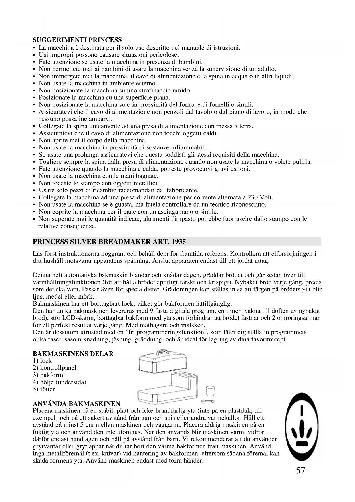 Placera maskinen på en stabil, platt och icke-brandfarlig yta (inte på en plastduk, till exempel) och på ett säkert avstånd från ugn och spis eller andra värmekällor. Håll ett avstånd på minst 5 cm mellan maskinen och väggarna. Placera aldrig maskinen på en fuktig yta och använd den inte utomhus. När den används blir maskinen varm, vidrör därför endast handtagen och håll på avstånd från barn. Vi rekommenderar att du använder grytvantar eller grytlappar när du tar bort den varma bakformen från maskinen. Använd inga metallföremål (t.ex. knivar) vid hantering av bakformen, eftersom sådana föremål kan skada formens yta. Använd maskinen endast med torra händer.58 Innan du använder bakformen och knådningsarmarna för första gången, tvätta dem noggrant i varmt tvålvatten och torka av dem. Maskinen kan alstra lite rök första gången den används. Detta är normalt för nya värmeelement och upphör efter en kort tid. Se till att locket placeras korrekt på apparaten! Om så inte är fallet, signaleras detta på displayen (ordet ”LID” kommer att tändas och släckas). Så snart locket har satts på korrekt fungerar apparaten igen. STEG-FÖR-STEG-BESKRIVNING Hela processen beskrivs nedan i korthet, steg för steg. De termer som används förklaras senare i instruktionerna. - Ta ut bakformen från bakmaskinen och sätt på de två knådningsarmarna på axlarna så att de är riktade mot varandra. - Väg eller mät ingredienserna enligt receptet och placera dem i bakformen. Börja med mjölet. Placera jästen i en litet hål i mjölet. Fortsätt med salt, smör eller olja, och sedan socker. Placera dessa i varsitt hörn. Häll vatten/mjölk längs kanterna (Jästen ska inte komma i kontakt med vattnet, saltet, smöret eller oljan. Det är särskilt viktigt när du ställer in baktiden med ”Timer”-knappen.) - Placera bakformen i bakmaskinen och tryck ned den ordentligt. Bakformen sitter nu på plats tack vare klämmorna. - Stäng locket och sätt in kontakten. 3:45 visas nu på displayen. - Välj önskat program med "SELECT COURSE”-knappen. - Använd ”CRUST CONTROL”-knappen för att ställa in önskad gräddningsnivå (ljus, medel eller mörk). Detta alternativ finns tillgängligt med programmen 1, 4, 8 och 10. - Om du vill använda TIMER-funktionen, kan du göra det nu (endast tillgänglig med programmen 1, 2, 3, 9 & 10). - Tryck på ”START”-knappen. - Efter första signalen kan ytterligare ingredienser tillsättas för fyllningen om så önskas. (se recepten i slutet av dessa instruktioner) - Den andra signalen ljuder när bakprocessen har slutförts. - VARNING: Bakformen och brödet är varma! Använd grytvantar när du tar bort bakformen från bakmaskinen och brödet från bakformen. Låt brödet kylas ned på ett galler. - OBS: Knådningsarmarna kan fortfarande sitta i brödet. Om så är fallet kan du ta bort dem försiktigt. Observera att knådningsarmarna är varma! - Om du vill baka ett till bröd ska du vänta några minuter tills att apparaten har kallnat tillräckligt. Bakmaskinen avger en pipsignal och ”HOT” visas på displayen om den inte kylts ned tillräckligt. - Stäng av apparaten när du är klar och ta ur kontakten från uttaget. - Det lättaste sättet att skära nybakat bröd är med Princess electrical knife (art 2952). KONTROLLPANEL Du kan stänga av och sätta på bakmaskinen med start/reset-knappen. För att sätta på: Tryck på start/reset-knappen. För att stänga av: Håll start/reset-knappen intryckt och räkna till 5. OBS: Om du stänger av bakmaskinen medan bakprocessen fortfarande pågår slutförs inte programmet, utan börjar från början. VÄLJ FÖRLOPP (SELECT COURSE) Välj meny Inställning på Beskrivning Varaktighet kontrollpanelen (med medelbrun gräddning) 1 Basic Grundrecept 3:45 2 Basic wheat Grundrecept, vete 3:55 3 Basic dough Grundrecept, deg 2:05 4 Quick Snabb 2:08 5 Quick wheat Snabbt veterecept 2:28 6 Quick dough Snabbdeg 0:45 7 Jam Sylt 1:20 8 Cake Mjuk kaka 2:00 9 Sandwich Sandwich 3:35 10 Home made Eget recept justerbar59