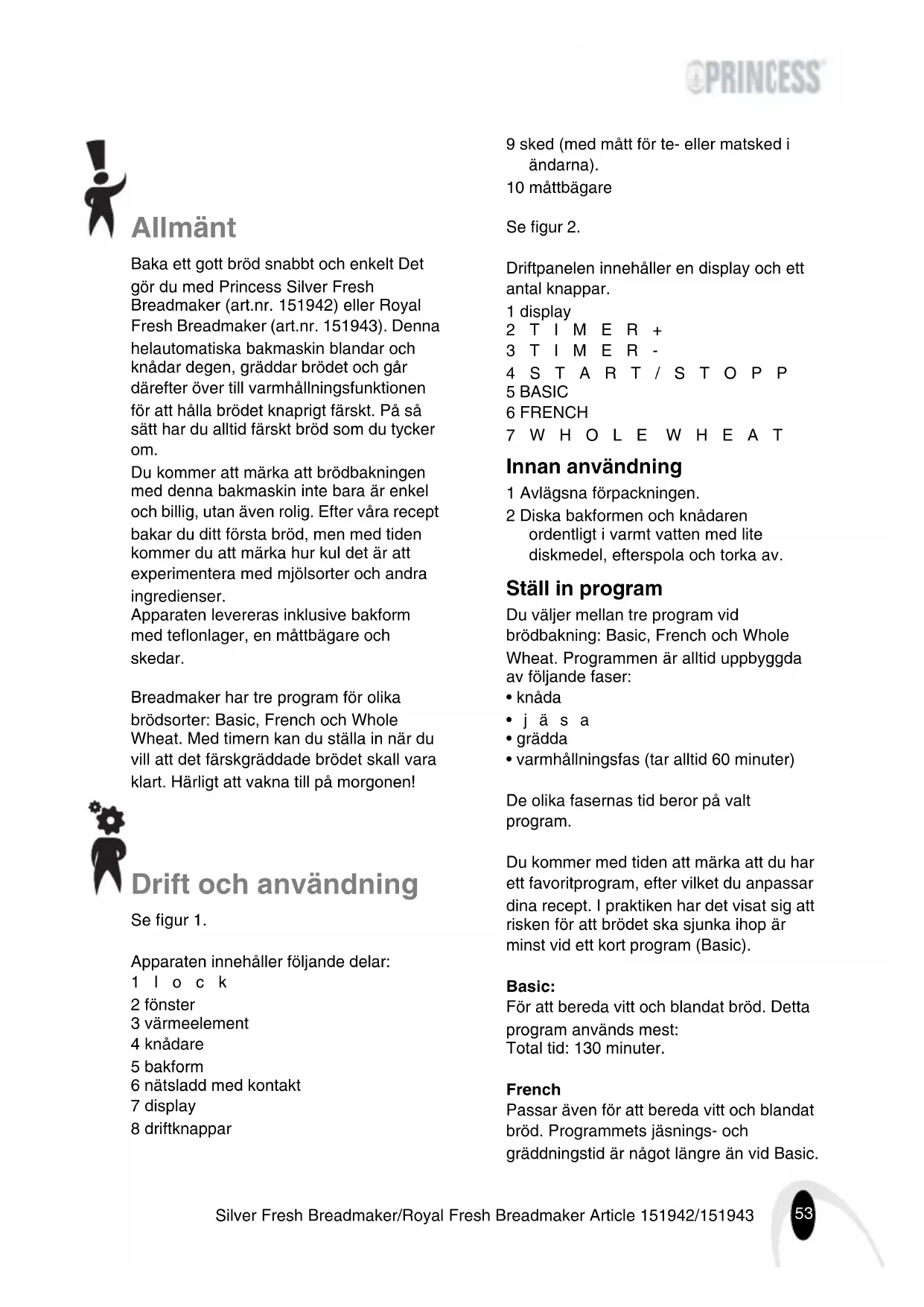 - varmhållningsfas (tar alltid 60 minuter) De olika fasernas tid beror på valt program. Du kommer med tiden att märka att du har ett favoritprogram, efter vilket du anpassar dina recept. I praktiken har det visat sig att risken för att brödet ska sjunka ihop är minst vid ett kort program (Basic). Basic: För att bereda vitt och blandat bröd. Detta program används mest: Total tid: 130 minuter. French Passar även för att bereda vitt och blandat bröd. Programmets jäsnings- och gräddningstid är något längre än vid Basic.54 Silver Fresh Breadmaker/Royal Fresh Breadmaker Article 151942/151943 Total tid: 150 minuter. Whole Wheat: För att bereda fullkornsbröd och bröd av tyngre mjölsorter. Total tid: 180 minuter. Vilket program som är lämpligast beror på flera olika faktorer. Det kan alltså vara så du bakar ditt favoritfullkornsbröd med Basic-programmet. Användning