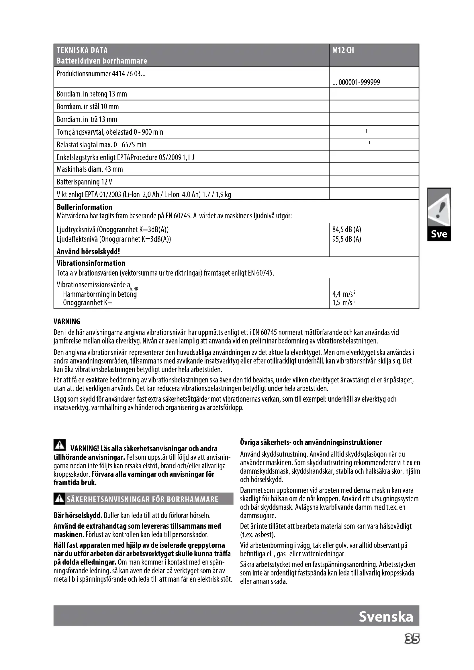 Bär hörselskydd. Buller kan leda till att du förlorar hörseln. Använd de extrahandtag som levereras tillsammans med maskinen. Förlust av kontrollen kan leda till personskador. Håll fast apparaten med hjälp av de isolerade greppytorna när du utför arbeten där arbetsverktyget skulle kunna träa på dolda elledningar. Om man kommer i kontakt med en spän- ningsförande ledning, så kan även de delar på verktyget som är av metall bli spänningsförande och leda till att man får en elektrisk stöt. Övriga säkerhets- och användningsinstruktioner Använd skyddsutrustning. Använd alltid skyddsglasögon när du använder maskinen. Som skyddsutrsutning rekommenderar vi t ex en dammskyddsmask, skyddshandskar, stabila och halksäkra skor, hjälm och hörselskydd. Dammet som uppkommer vid arbeten med denna maskin kan vara skadligt för hälsan om de når kroppen. Använd ett utsugningssystem och bär skyddsmask. Avlägsna kvarblivande damm med t.ex. en dammsugare. Det är inte tillåtet att bearbeta material som kan vara hälsovådligt (t.ex. asbest). Vid arbetenborrning i vägg, tak eller golv, var alltid observant på bentliga el-, gas- eller vattenledningar. Säkra arbetsstycket med en fastspänningsanordning. Arbetsstycken som inte är ordentligt fastspända kan leda till allvarlig kroppsskada eller annan skada. TEKNISKA DATA Batteridriven borrhammare M12 CH Produktionsnummer 4414 76 03... ... 000001-999999 Borrdiam. in betong 13 mm Borrdiam. in stål 10 mm Borrdiam. in trä 13 mm Tomgångsvarvtal, obelastad 0 - 900 min