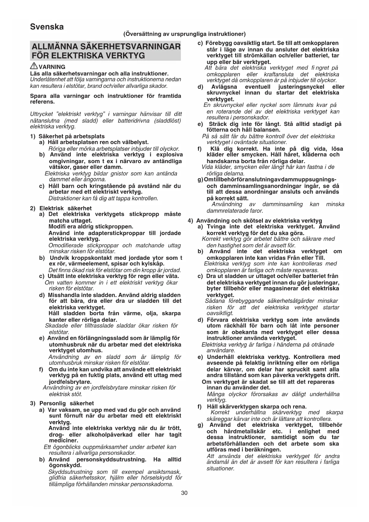 VARNING Läs alla säkerhetsvarningar och alla instruktioner. Underlåtenhet att följa varningarna och instruktionerna nedan kan resultera i elstötar, brand och/eller allvarliga skador. Spara alla varningar och instruktioner för framtida referens. Uttrycket ”elektriskt verktyg” i varningar hänvisar till ditt nätanslutna (med sladd) eller batteridrivna (sladdlöst) elektriska verktyg.