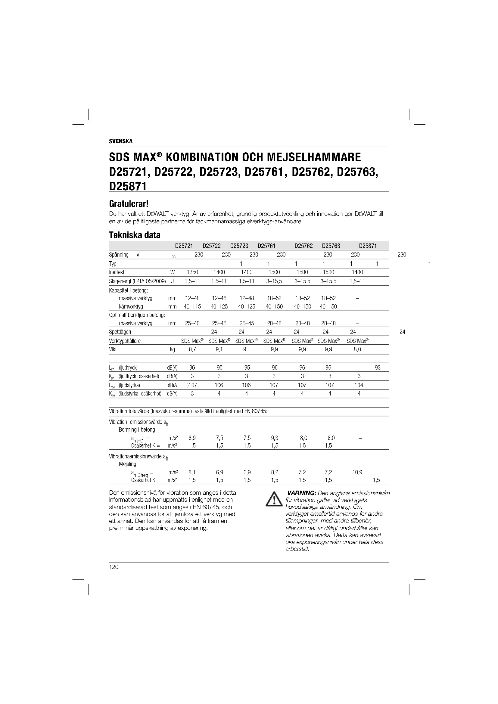 D25721, D25722, D25723, D25761, D25762, D25763, D25871 Gratulerar! Du har valt ett DEWALT-verktyg. År av erfarenhet, grundlig produktutveckling och innovation gör DEWALT till en av de pålitligaste partnerna för fackmannamässiga elverktygs-användare. Tekniska data D25721 D25722 D25723 D25761 D25762 D25763 D25871 Spänning V