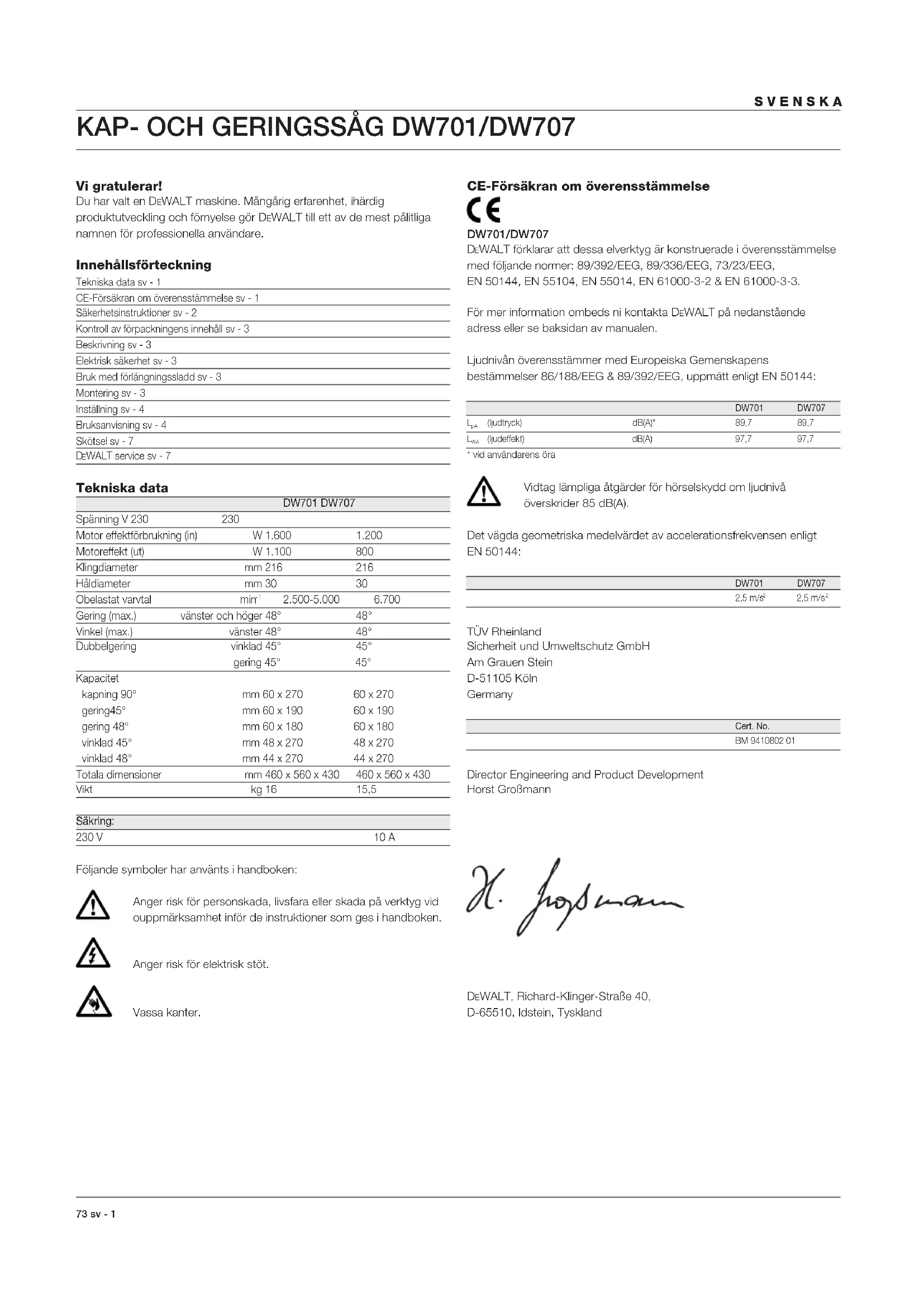 2.500-5.000 6.700 Gering (max.) vänster och höger 48° 48° Vinkel (max.) vänster 48° 48° Dubbelgering vinklad 45° 45° gering 45° 45° Kapacitet kapning 90° mm 60 x 270 60 x 270 gering45° mm 60 x 190 60 x 190 gering 48° mm 60 x 180 60 x 180 vinklad 45° mm 48 x 270 48 x 270 vinklad 48° mm 44 x 270 44 x 270 Totala dimensioner mm 460 x 560 x 430 460 x 560 x 430 Vikt kg 16 15,5 Säkring: 230 V 10 A Följande symboler har använts i handboken: Anger risk för personskada, livsfara eller skada på verktyg vid ouppmärksamhet inför de instruktioner som ges i handboken. Anger risk för elektrisk stöt. Vassa kanter. CE-Försäkran om överensstämmelse DW701/DW707