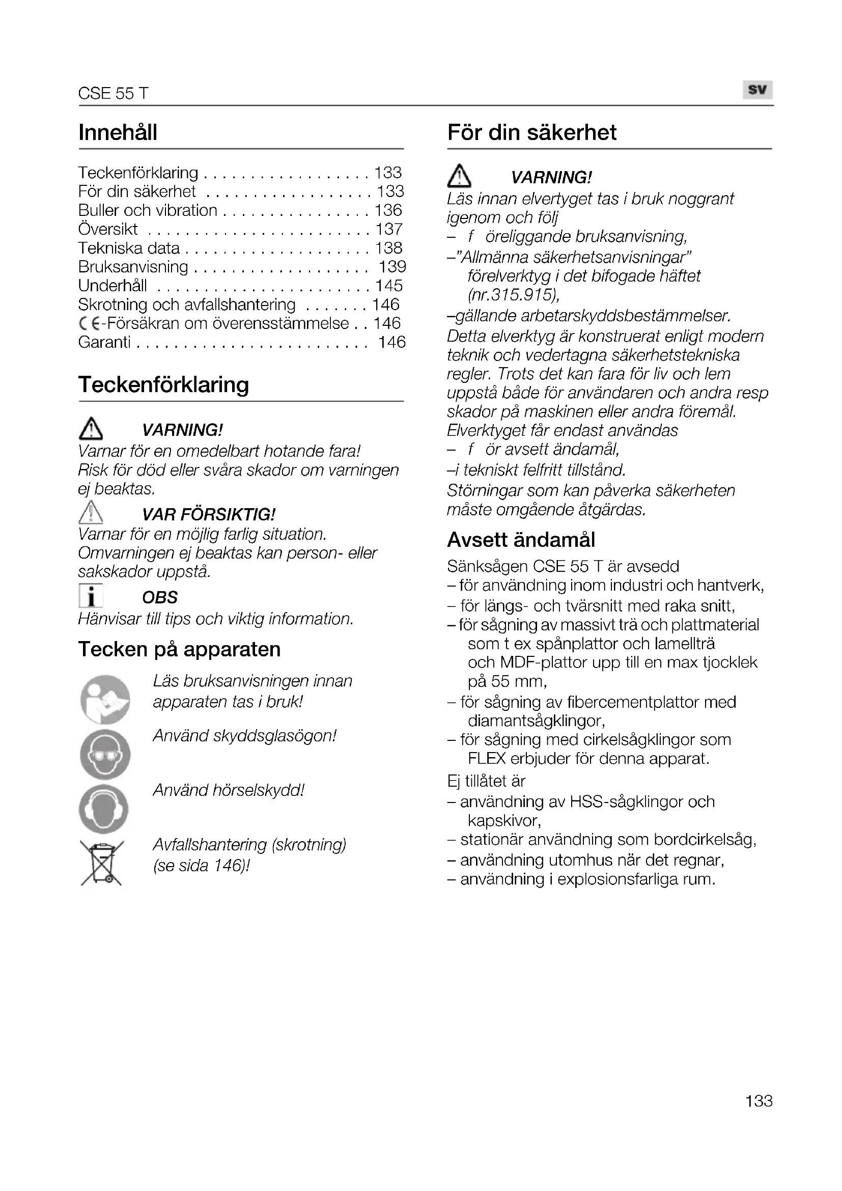 - Garanti Teckenförklaring s^okfkd> s~êå~ê=Ñ∏ê=Éå=çãÉÇÉäÄ~êí=Üçí~åÇÉ=Ñ~ê~>= oáëâ Ñ∏ê=Ç∏Ç=ÉääÉê=ëî™ê~=ëâ~Ççê=çã=î~êåáåÖÉå= Éà=ÄÉ~âí~ëK s^o=c£opfhqfd> s~êå~ê=Ñ∏ê=Éå=ã∏àäáÖ=Ñ~êäáÖ=ëáíì~íáçåK= lã î~êåáåÖÉå=Éà=ÄÉ~âí~ë=â~å=éÉêëçåJ=ÉääÉê= ë~âëâ~Ççê=ìééëí™K l_p e®åîáë~ê=íáää=íáéë=çÅÜ=îáâíáÖ=áåÑçêã~íáçåK Tecken på apparaten i®ë=Äêìâë~åîáëåáåÖÉå=áåå~å= ~éé~ê~íÉå=í~ë=á=Äêìâ> ^åî®åÇ=ëâóÇÇëÖä~ë∏Öçå> ^åî®åÇ=Ü∏êëÉäëâóÇÇ> ^îÑ~ääëÜ~åíÉêáåÖ=EëâêçíåáåÖF= EëÉ=ëáÇ~=NQSF> För din säkerhet s^okfkd> i®ë=áåå~å=ÉäîÉêíóÖÉí=í~ë=á=Äêìâ=åçÖÖê~åí= áÖÉåçã=çÅÜ=Ñ∏äà ÓÑ∏êÉäáÖÖ~åÇÉ=Äêìâë~åîáëåáåÖI Ó Ò^ääã®åå~=ë®âÉêÜÉíë~åîáëåáåÖ~êÒ= Ñ∏ê ÉäîÉêâíóÖ=á=ÇÉí=ÄáÑçÖ~ÇÉ=Ü®ÑíÉí= EåêK PNRKVNRFI Ó Ö®ää~åÇÉ=~êÄÉí~êëâóÇÇëÄÉëí®ããÉäëÉêK aÉíí~=ÉäîÉêâíóÖ=®ê=âçåëíêìÉê~í=ÉåäáÖí=ãçÇÉêå= íÉâåáâ=çÅÜ=îÉÇÉêí~Öå~=ë®âÉêÜÉíëíÉâåáëâ~= êÉÖäÉêK=qêçíë=ÇÉí=â~å=Ñ~ê~=Ñ∏ê=äáî=çÅÜ=äÉã= ìééëí™=Ä™ÇÉ=Ñ∏ê=~åî®åÇ~êÉå=çÅÜ=~åÇê~=êÉëé= ëâ~Ççê=é™=ã~ëâáåÉå=ÉääÉê=~åÇê~=Ñ∏êÉã™äK= bäîÉêâíóÖÉí=Ñ™ê=ÉåÇ~ëí=~åî®åÇ~ë ÓÑ∏ê=~îëÉíí=®åÇ~ã™äI Ó á=íÉâåáëâí=ÑÉäÑêáíí=íáääëí™åÇK pí∏êåáåÖ~ê=ëçã=â~å=é™îÉêâ~=ë®âÉêÜÉíÉå= ã™ëíÉ=çãÖ™ÉåÇÉ=™íÖ®êÇ~ëK Avsett ändamål Sänksågen CSE 55 T är avsedd – för användning inom industri och hantverk, – för längs- och tvärsnitt med raka snitt, – för sågning av massivt trä och plattmaterial som t ex spånplattor och lamellträ och MDF-plattor upp till en max tjocklek på 55 mm, – för sågning av fibercementplattor med diamantsågklingor, – för sågning med cirkelsågklingor som FLEX erbjuder för denna apparat. Ej tillåtet är – användning av HSS-sågklingor och kapskivor, – stationär användning som bordcirkelsåg, – användning utomhus när det regnar, – användning i explosionsfarliga rum.CSE 55 T p. 146