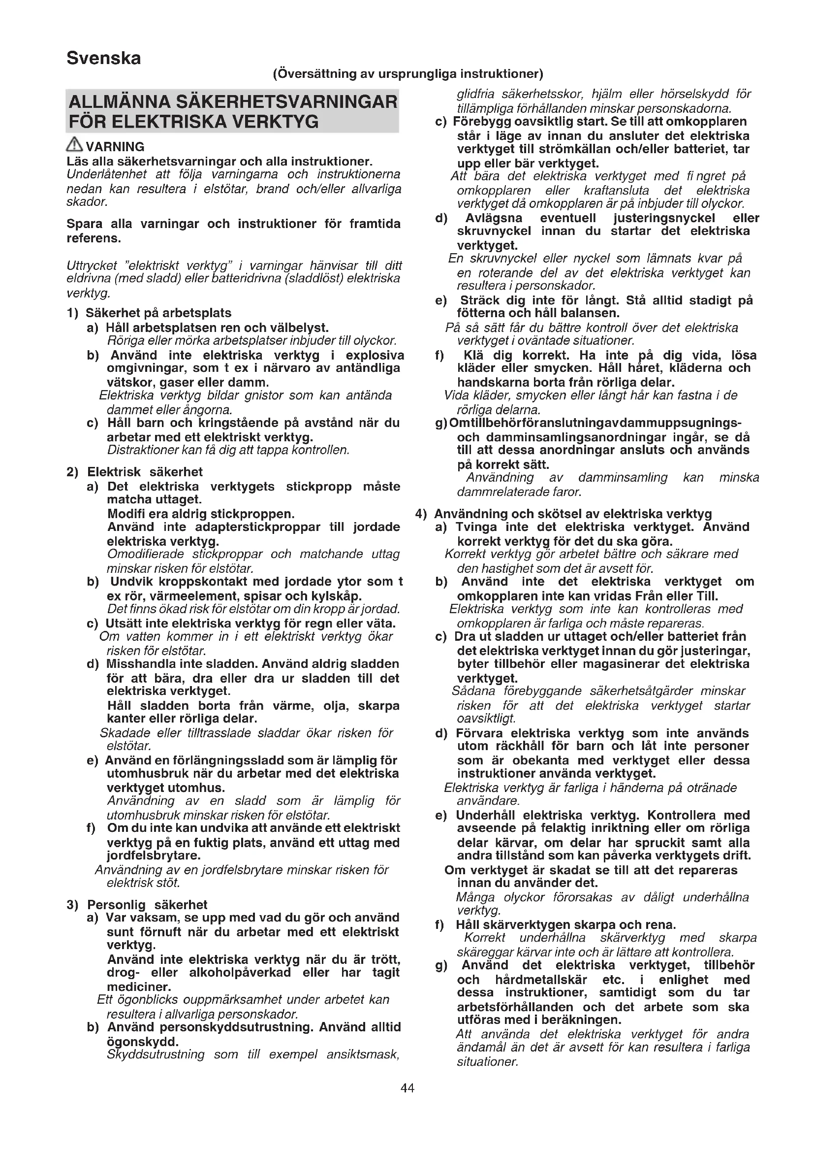 4) Användning och skötsel av elektriska verktyg