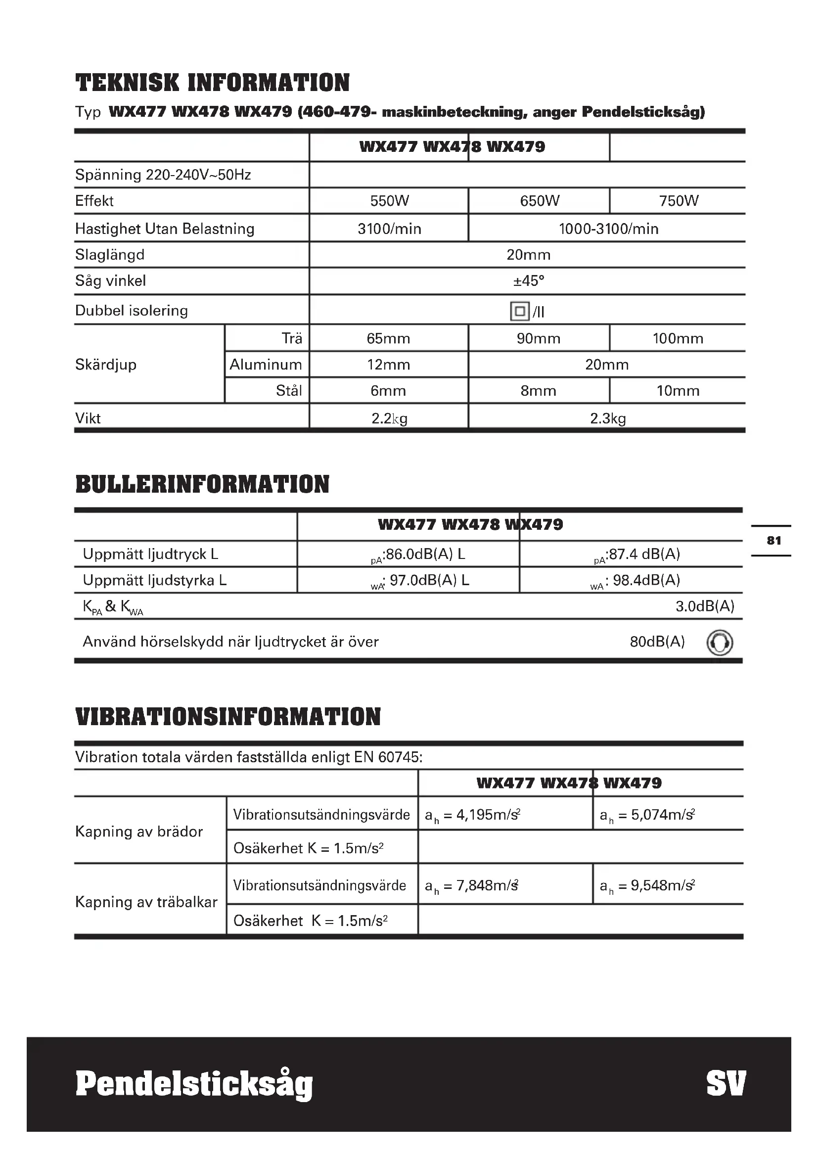 3.0dB(A) Använd hörselskydd när ljudtrycket är över 80dB(A) VIBRATIONSINFORMATION Vibration totala värden fastställda enligt EN 60745: WX477 WX478 WX479 Kapning av brädor Vibrationsutsändningsvärde