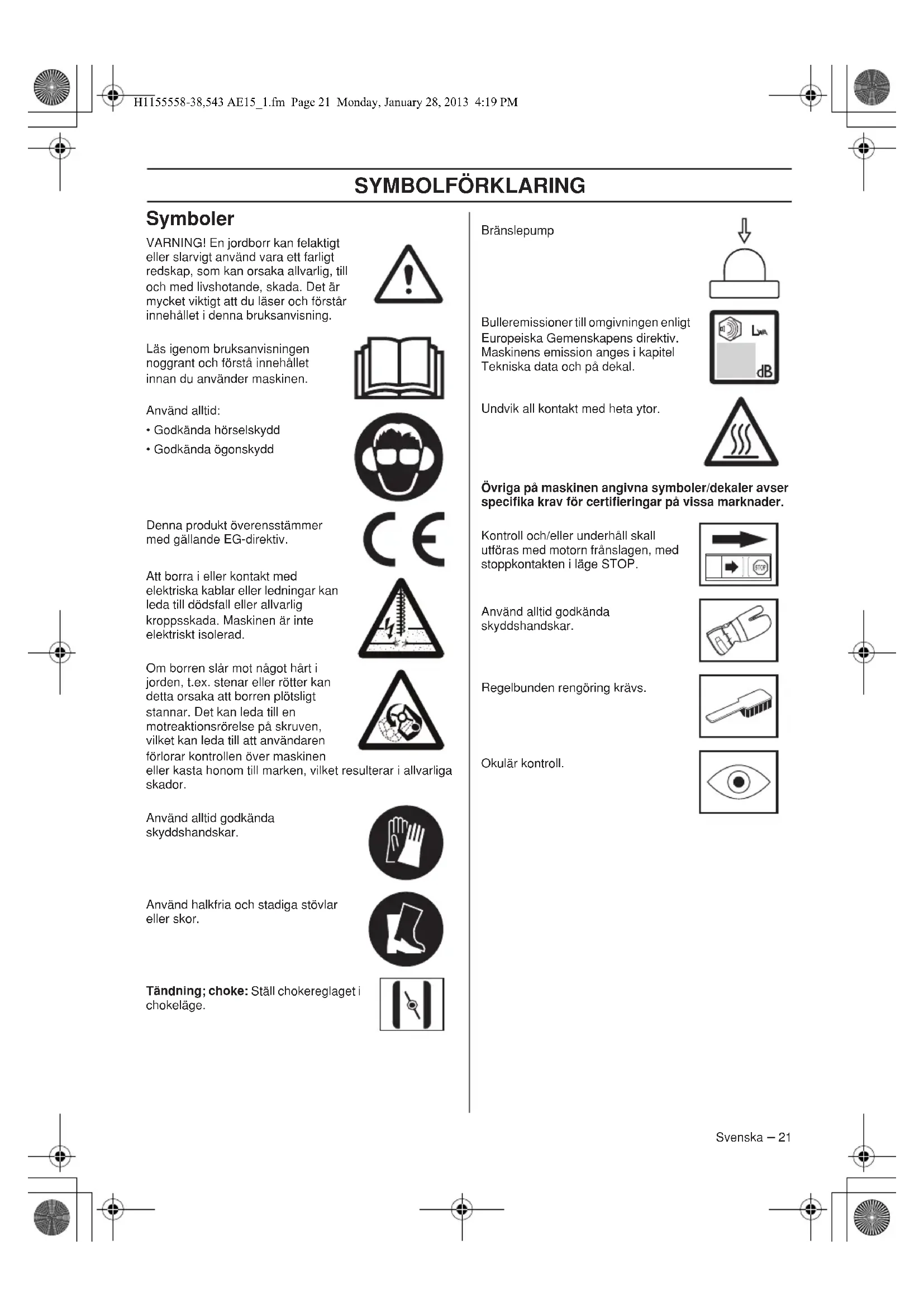 VARNING! En jordborr kan felaktigt aller slarvigt anvand vara ett farligt redskap, som kan orsaka allvarlg, till och med livshotande, skada. Det ar mycket viktigt att du laer och forstar innehallet ienna braupsanvisning.