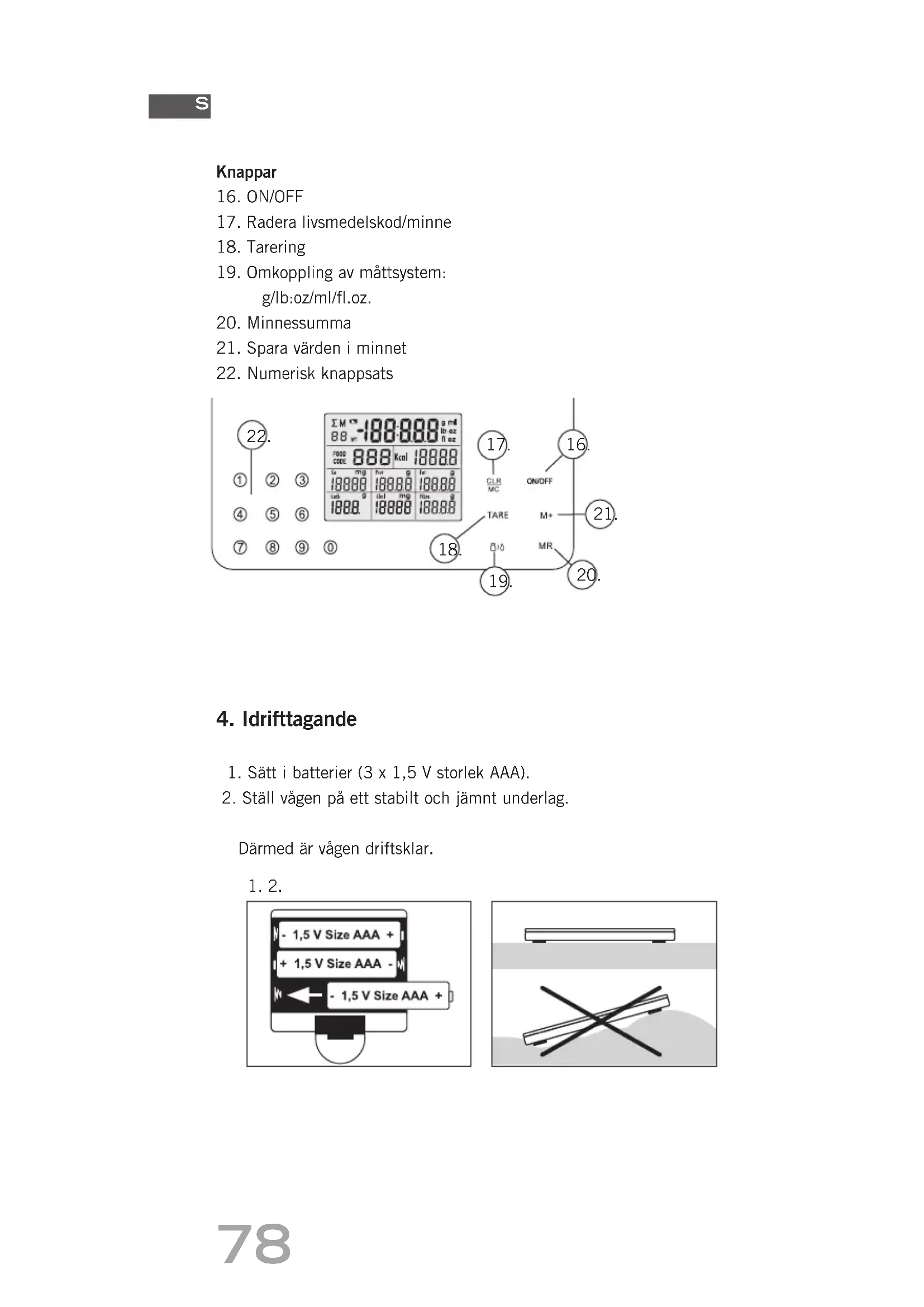 Varning ō.DVWDDOGULJDQYÃQGDEDWWHULHULHOGHQ([SORVLRQVULVN ō.RUWVOXWDOGULJEDWWHULHU Varning ō/ÆWHQOÃNDUHHOOHUHQGLHWVSHFLDOLVWJHGLJUÆGLQIùUHQSODQHUDG viktminskning. ō9LGIHODNWLJWKDQGKDYDQGHHOOHURPIHODNWLJDXSSJLIWHUPDWDVLQNDQ apparaten leverera resultat, som kan leda till felnäring och/eller hälsorisker för personer som måste hålla en viss diet. ō)ùUYDUDDSSDUDWHQRÆWNRPOLJWIùUVPÆEDUQ ō7ÃQNSÆDWWDQYÃQGDUÃWWW\SDYEDWWHUL6ÃWWLQEDWWHULHWÆWUÃWWKÆOO Vid byte av batteri ska alltid ett färskt batteri användas och aldrig ett som uppvisar tydliga skador – det kan leda till överhettning eller explosioner. ō)ùUYDUDDOOWLGEDWWHULHUXWRPUÃFNKÆOOIùUEDUQ Försiktigt! ō'HHQVNLOGDGHODUQDDYGHQQDDSSDUDWIÆULQWHPRQWHUDVLVÃUUHSD- reras eller byggas om. ō%DWWHULHULQQHKÆOOHUNHPLNDOLHU2PGHVVDNRPPHUXWNDQGHRUVD- ka sakskador och kroppsskador. Om man får batterisyra i ögonen, måste man omedelbart skölja med riktigt med vatten och därefter omedelbart uppsöka sjukvården. ō7DERUWEDWWHULHUQDXUDSSDUDWHQRPGHQLQWHVNDDQYÃQGDVXQGHU en lång tid. Anvisningar ō0ÃWUHVXOWDWHWNDQEOLIHO - i närheten av mobiltelefoner - i närheten av värmekällor eller på platser där temperaturen varierar - på platser där luftfuktigheten är stor och - på platser som är utsatta för vibrationer och stötar. - på ojämnt underlag. ō8WVÃWWLQWHDSSDUDWHQIùUGLUHNWVROEHVWUÆOQLQJ ō%HODVWHSODWWIRUPHQHQGDVWIùUDWWYÃJD/ÃPQDLQWHNYDUIùUHPÆO77