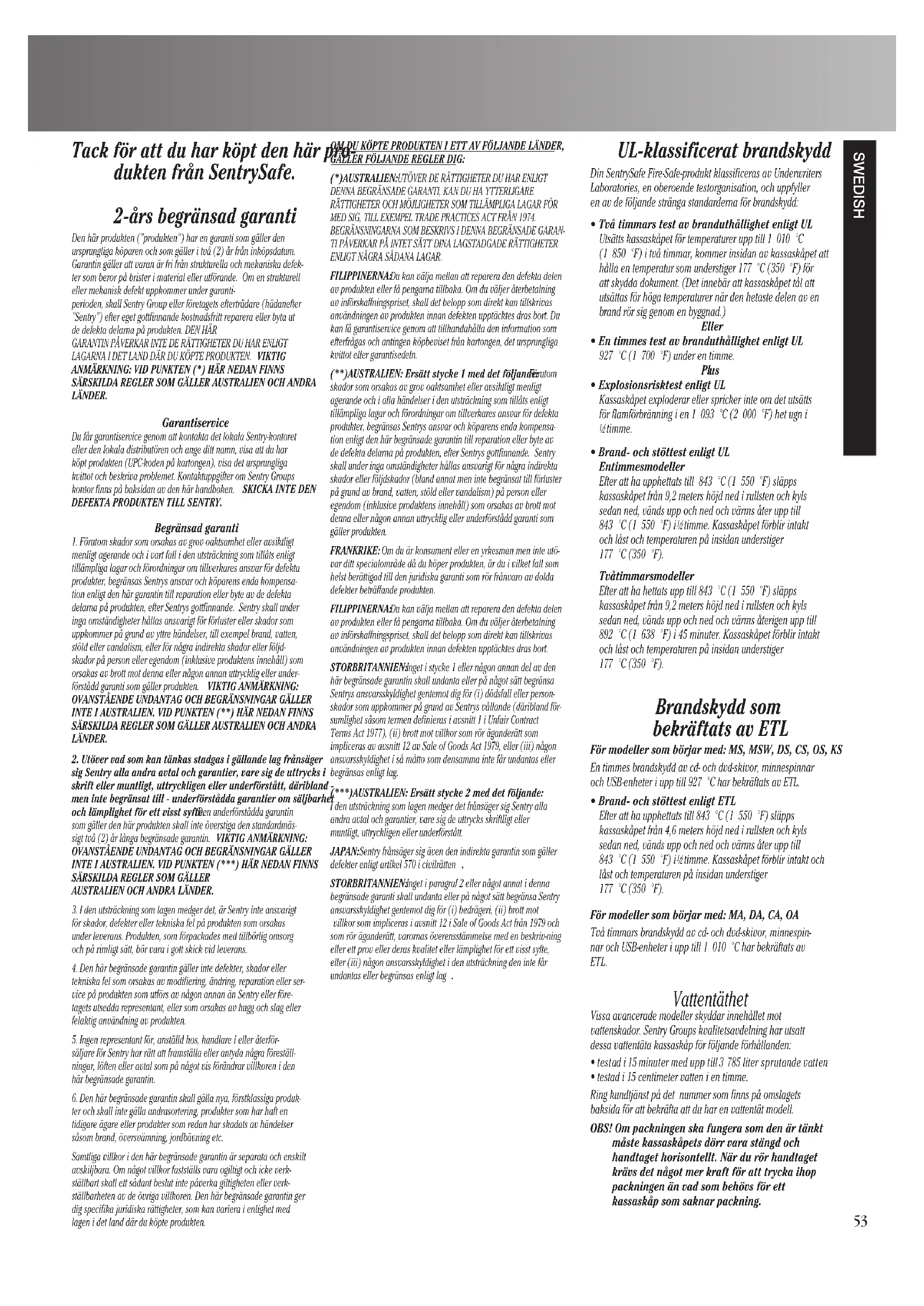 ter och skall inte gälla andrasortering, produkter som har haft en tidigare ägare eller produkter som redan har skadats av händelser såsom brand, översvämning, jordbävning etc. Samtliga villkor i den här begränsade garantin är separata och enskilt avskiljbara. Om något villkor fastställs vara ogiltigt och icke verk- ställbart skall ett sådant beslut inte påverka giltigheten eller verk- ställbarheten av de övriga villkoren. Den här begränsade garantin ger dig specifika juridiska rättigheter, som kan variera i enlighet med lagen i det land där du köpte produkten. OM DU KÖPTE PRODUKTEN I ETT AV FÖLJANDE LÄNDER, GÄLLER FÖLJANDE REGLER DIG: (*)AUSTRALIEN: UTÖVER DE RÄTTIGHETER DU HAR ENLIGT DENNA BEGRÄNSADE GARANTI, KAN DU HA YTTERLIGARE RÄTTIGHETER OCH MÖJLIGHETER SOM TILLÄMPLIGA LAGAR FÖR MED SIG, TILL EXEMPEL TRADE PRACTICES ACT FRÅN 1974. BEGRÄNSNINGARNA SOM BESKRIVS I DENNA BEGRÄNSADE GARAN- TI PÅVERKAR PÅ INTET SÄTT DINA LAGSTADGADE RÄTTIGHETER ENLIGT NÅGRA SÅDANA LAGAR. FILIPPINERNA: Du kan välja mellan att reparera den defekta delen av produkten eller få pengarna tillbaka. Om du väljer återbetalning av införskaffningspriset, skall det belopp som direkt kan tillskrivas användningen av produkten innan defekten upptäcktes dras bort. Du kan få garantiservice genom att tillhandahålla den information som efterfrågas och antingen köpbeviset från kartongen, det ursprungliga kvittot eller garantisedeln. (**)AUSTRALIEN: Ersätt stycke 1 med det följande: Förutom skador som orsakas av grov oaktsamhet eller avsiktligt menligt agerande och i alla händelser i den utsträckning som tillåts enligt tillämpliga lagar och förordningar om tillverkares ansvar för defekta produkter, begränsas Sentrys ansvar och köparens enda kompensa- tion enligt den här begränsade garantin till reparation eller byte av de defekta delarna på produkten, efter Sentrys gottfinnande. Sentry skall under inga omständigheter hållas ansvarigt för några indirekta skador eller följdskador (bland annat men inte begränsat till förluster på grund av brand, vatten, stöld eller vandalism) på person eller egendom (inklusive produktens innehåll) som orsakas av brott mot denna eller någon annan uttrycklig eller underförstådd garanti som gäller produkten. FRANKRIKE: Om du är konsument eller en yrkesman men inte utö- var ditt specialområde då du köper produkten, är du i vilket fall som helst berättigad till den juridiska garanti som rör frånvaro av dolda defekter beträffande produkten. FILIPPINERNA: Du kan välja mellan att reparera den defekta delen av produkten eller få pengarna tillbaka. Om du väljer återbetalning av införskaffningspriset, skall det belopp som direkt kan tillskrivas användningen av produkten innan defekten upptäcktes dras bort. STORBRITANNIEN: Inget i stycke 1 eller någon annan del av den här begränsade garantin skall undanta eller på något sätt begränsa Sentrys ansvarsskyldighet gentemot dig för (i) dödsfall eller person- skador som uppkommer på grund av Sentrys vållande (däribland för- sumlighet såsom termen definieras i avsnitt 1 i Unfair Contract Terms Act 1977), (ii) brott mot villkor som rör äganderätt som impliceras av avsnitt 12 av Sale of Goods Act 1979, eller (iii) någon ansvarsskyldighet i så måtto som densamma inte får undantas eller begränsas enligt lag. (***)AUSTRALIEN: Ersätt stycke 2 med det följande: I den utsträckning som lagen medger det frånsäger sig Sentry alla andra avtal och garantier, vare sig de uttrycks skriftligt eller muntligt, uttryckligen eller underförstått. JAPAN: Sentry frånsäger sig även den indirekta garantin som gäller defekter enligt artikel 570 i civilrätten