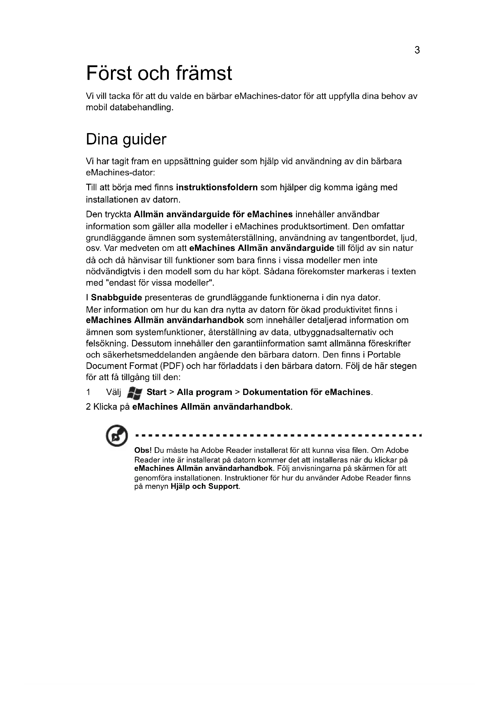 4eMachines bärbar-serien SnabbguideModellnummer: ________________________________ Serienummer: _________________________________ Inköpsdatum: __________________________________ Inköpsställe: __________________________________ © 2010 Med ensamrätt. Snabbguide för eMachines bärbar-serien Ursprunglig utgåva: 06/20103 Först och främst Vi vill tacka för att du valde en bärbar eMachines-dator för att uppfylla dina behov av mobil databehandling. Dina guider Vi har tagit fram en uppsättning guider som hjälp vid användning av din bärbara eMachines-dator: Till att börja med finns instruktionsfoldern som hjälper dig komma igång med installationen av datorn. Den tryckta Allmän användarguide för eMachines innehåller användbar information som gäller alla modeller i eMachines produktsortiment. Den omfattar grundläggande ämnen som systemåterställning, användning av tangentbordet, ljud, osv. Var medveten om att eMachines Allmän användarguide till följd av sin natur då och då hänvisar till funktioner som bara finns i vissa modeller men inte nödvändigtvis i den modell som du har köpt. Sådana förekomster markeras i texten med "endast för vissa modeller". I Snabbguide presenteras de grundläggande funktionerna i din nya dator. Mer information om hur du kan dra nytta av datorn för ökad produktivitet finns i eMachines Allmän användarhandbok som innehåller detaljerad information om ämnen som systemfunktioner, återställning av data, utbyggnadsalternativ och felsökning. Dessutom innehåller den garantiinformation samt allmänna föreskrifter och säkerhetsmeddelanden angående den bärbara datorn. Den finns i Portable Document Format (PDF) och har förladdats i den bärbara datorn. Följ de här stegen för att få tillgång till den: 1Välj Start > Alla program > Dokumentation för eMachines. 2 Klicka på eMachines Allmän användarhandbok. Obs! Du måste ha Adobe Reader installerat för att kunna visa filen. Om Adobe Reader inte är installerat på datorn kommer det att installeras när du klickar på eMachines Allmän användarhandbok. Följ anvisningarna på skärmen för att genomföra installationen. Instruktioner för hur du använder Adobe Reader finns på menyn Hjälp och Support.4 Svenska Beskrivning av din bärbara eMachines-dator När du har installerat datorn enligt illustrationen i instruktionsfoldern vill vi beskriva din nya bärbara eMachines-dator. Vy över ovansidan