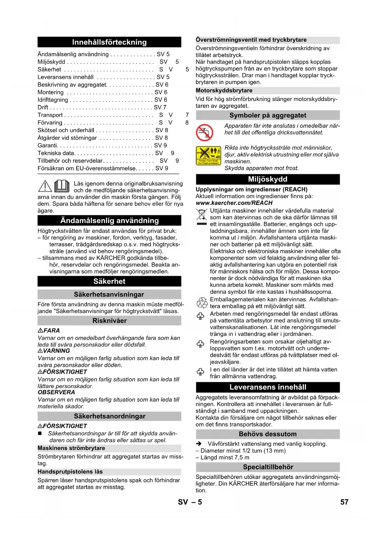92 dB(A) Det tas forbehold om tekniske endringer. Tilbehør og reservedeler EU-samsvarserklæring Produkt: Høytrykksvasker Type: 1.324-xxx Relevante EU-direktiver 2000/14/EF 2014/30/EU 2006/42/EF (+2009/127/EF) 2011/65/EU Anvendte overensstemmende normer EN 50581 EN 55014–1: 2006+A1: 2009+A2: 2011 EN 55014–2: 1997+A1: 2001+A2: 2008 EN 60335–1 EN 60335–2–79 EN 61000–3–2: 2014 EN 61000–3–3: 2013 EN 62233: 2008 Anvendt metode for samsvarsvurdering 2000/14/EF: Vedlegg V Lydeffektnivå dB(A) Målt: 89 Garantert: 92 Winnenden, 2016/01/01 CEO Head of Approbation 56 NO– 5 Läs igenom denna originalbruksanvisning och de medföljande säkerhetsanvisning- arna innan du använder din maskin första gången. Följ dem. Spara båda häftena för senare behov eller för nya ägare. Högtryckstvätten får endast användas för privat bruk: – för rengöring av maskiner, fordon, verktyg, fasader, terrasser, trädgårdsredskap o.s.v. med högtrycks- stråle (använd vid behov rengöringsmedel). – tillsammans med av KÄRCHER godkända tillbe- hör, reservdelar och rengöringsmedel. Beakta an- visningarna som medföljer rengöringsmedlen. Före första användning av denna maskin müste medföl- jande "Säkerhetsanvisningar för högtryckstvätt" läsas. FARA Varnar om en omedelbart överhängande fara som kan leda till svåra personskador eller dödsfall. 몇 VARNING Varnar om en möjligen farlig situation som kan leda till svåra personskador eller döden. 몇 FÖRSIKTIGHET Varnar om en möjligen farlig situation som kan leda till lättare personskador. OBSERVERA Varnar om en möjligen farlig situation som kan leda till materiella skador. 몇 FÖRSIKTIGHET Säkerhetsanordningar är till för att skydda använ- daren och får inte ändras eller sättas ur spel. Strömbrytaren förhindrar att aggregatet startas av miss- tag. Spärren låser handsprutspistolens spak och förhindrar att aggregatet startas av misstag. Överströmningsventieln förhindrar överskridning av tillåtet arbetstryck. När handtaget på handsprutpistolen släpps kopplas högtryckspumpen från av en tryckbrytare som stoppar högtrycksstrålen. Drar man i handtaget kopplar tryck- brytaren in pumpen igen. Vid för hög strömförbrukning stänger motorskyddsbry- taren av aggregatet. Upplysningar om ingredienser (REACH) Aktuell information om ingredienser finns på: www.kaercher.com/REACH Aggregatets leveransomfattning är avbildat på förpack- ningen. Kontrollera att innehållet i leveransen är full- ständigt i samband med uppackningen. Kontakta din försäljare om något tillbehör saknas eller om det finns transportskador. Vävförstärkt vattenslang med vanlig koppling. – Diameter minst 1/2 tum (13 mm) – Längd minst 7,5 m Specialtillbehören utökar aggregatets användningsmöj- ligheter. Din KÄRCHER återförsäljare har mer informa- tion. Innehållsförteckning Ändamålsenlig användning . . . . . . . . . . . . . . SV 5 Miljöskydd . . . . . . . . . . . . . . . . . . . . . . . . . . .SV 5 Säkerhet . . . . . . . . . . . . . . . . . . . . . . . . . . . .SV 5 Leveransens innehåll . . . . . . . . . . . . . . . . . . SV 5 Beskrivning av aggregatet. . . . . . . . . . . . . . . SV 6 Montering . . . . . . . . . . . . . . . . . . . . . . . . . . . SV 6 Idrifttagning . . . . . . . . . . . . . . . . . . . . . . . . . . SV 6 Drift . . . . . . . . . . . . . . . . . . . . . . . . . . . . . . . . SV 7 Transport . . . . . . . . . . . . . . . . . . . . . . . . . . . .SV 7 Förvaring . . . . . . . . . . . . . . . . . . . . . . . . . . . .SV 8 Skötsel och underhåll . . . . . . . . . . . . . . . . . . SV 8 Åtgärder vid störningar . . . . . . . . . . . . . . . . . SV 8 Garanti. . . . . . . . . . . . . . . . . . . . . . . . . . . . . . SV 9 Tekniska data. . . . . . . . . . . . . . . . . . . . . . . . . SV9 Tillbehör och reservdelar. . . . . . . . . . . . . . . . SV 9 Försäkran om EU-överensstämmelse. . . . . . SV 9 Ändamålsenlig användning Säkerhet Säkerhetsanvisningar Risknivåer Säkerhetsanordningar Maskinens strömbrytare Handsprutpistolens lås Överströmningsventil med tryckbrytare Motorskyddsbrytare Symboler på aggregatet Apparaten får inte anslutas i omedelbar när- het till det offentliga dricksvattennätet. Rikta inte högtrycksstråle mot människor, djur, aktiv elektrisk utrustning eller mot själva maskinen. Skydda apparaten mot frost. Miljöskydd Uttjänta maskiner innehåller värdefulla material som kan återvinnas och de ska därför lämnas till ett insamlingsställe. Batterier, engångs och upp- laddningsbara, innehåller ämnen som inte får komma ut i miljön. Avfallshantera uttjänta maski- ner och batterier på ett miljövänligt sätt. Elektriska och elektroniska maskiner innehåller ofta komponenter som vid felaktig användning eller fel- aktig avfallshantering kan utgöra en potentiell risk för människors hälsa och för miljön. Dessa kompo- nenter är dock nödvändiga för att maskinen ska kunna arbeta korrekt. Maskiner som märkts med denna symbol får inte kastas i hushållssoporna. Emballagematerialen kan återvinnas. Avfallshan- tera emballag på ett miljövänligt sätt. Arbeten med rengöringsmedel får endast utföras på vattentäta arbetsytor med anslutning till smuts- vattenskanalisationen. Låt inte rengöringsmedel tränga in i vattendrag eller i jordmånen. Rengöringsarbeten som orsakar oljehaltigt av- loppsvatten som t.ex. motortvätt och underre- destvätt får endast utföras på tvättplatser med ol- jeavskiljare. I en del länder är det inte tillåtet att hämta vatten från allmänna vattendrag. Leveransens innehåll Behövs dessutom Specialtillbehör 57SV– 6 I denna bruksanvisning beskrivs aggregatet med maxi- mal utrustning. Leveransomfånget varierar allt efter mo- dell (se förpackningen). Figurer och bilder finns på kartongens ut- fällbara sida 4 1 Kopplingsdel för vattenanslutning 2 Vattenanslutning med inbyggt filter 3 Högtrycksslang 