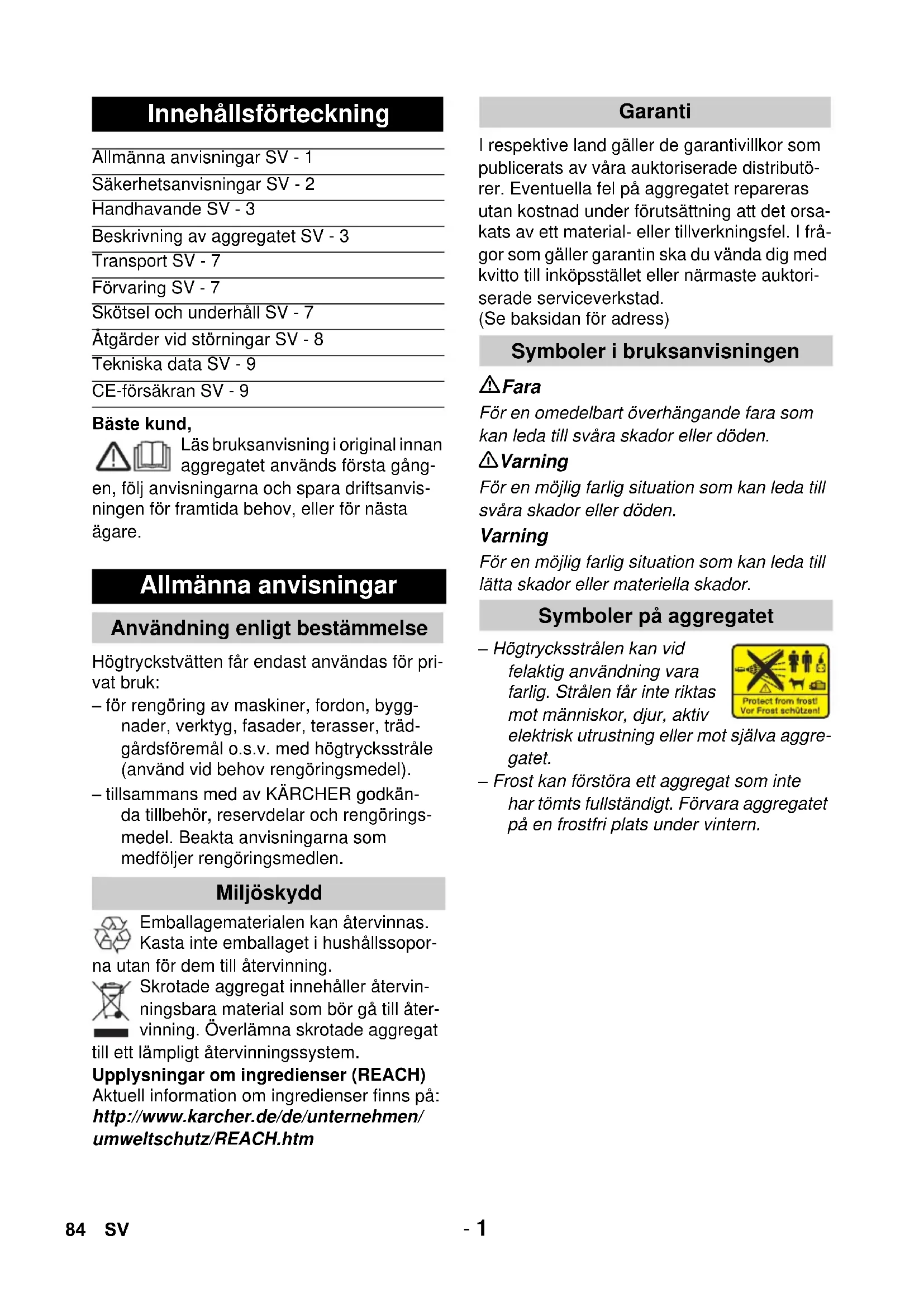 dB(A) 92 93 89 CE-erklæring Produkt: Høytrykksvasker Type: 1.180-xxx 1.181-xxx Relevante EU-direktiver 2006/42/EF (+2009/127/EF) 2004/108/EF 2000/14/EF Anvendte overensstemmende normer EN 55014–1: 2006 EN 55014–2: 1997 + A1: 2001 EN 60335–1 EN 60335–2–79 EN 61000–3–2: 2006 EN 61000–3–3: 2008 EN 62233: 2008 Anvendt metode for samsvarsvurdering Vedlegg V Lydeffektnivå dB(A) K 3.700 K 4.700 K 5.700 Målt: 90 90 87 Garanteret: 92 93 89 CEO Head of Approbation 83NO- 1 Bäste kund, Läs bruksanvisning i original innan aggregatet används första gång- en, följ anvisningarna och spara driftsanvis- ningen för framtida behov, eller för nästa ägare. Högtryckstvätten får endast användas för pri- vat bruk: – för rengöring av maskiner, fordon, bygg- nader, verktyg, fasader, terasser, träd- gårdsföremål o.s.v. med högtrycksstråle (använd vid behov rengöringsmedel). – tillsammans med av KÄRCHER godkän- da tillbehör, reservdelar och rengörings- medel. Beakta anvisningarna som medföljer rengöringsmedlen. Emballagematerialen kan återvinnas. Kasta inte emballaget i hushållssopor- na utan för dem till återvinning. Skrotade aggregat innehåller återvin- ningsbara material som bör gå till åter- vinning. Överlämna skrotade aggregat till ett lämpligt återvinningssystem. Upplysningar om ingredienser (REACH) Aktuell information om ingredienser finns på: http://www.karcher.de/de/unternehmen/ umweltschutz/REACH.htm I respektive land gäller de garantivillkor som publicerats av våra auktoriserade distributö- rer. Eventuella fel på aggregatet repareras utan kostnad under förutsättning att det orsa- kats av ett material- eller tillverkningsfel. I frå- gor som gäller garantin ska du vända dig med kvitto till inköpsstället eller närmaste auktori- serade serviceverkstad. (Se baksidan för adress) Fara För en omedelbart överhängande fara som kan leda till svåra skador eller döden. 몇 Varning För en möjlig farlig situation som kan leda till svåra skador eller döden. Varning För en möjlig farlig situation som kan leda till lätta skador eller materiella skador. – Högtrycksstrålen kan vid felaktig användning vara farlig. Strålen får inte riktas mot människor, djur, aktiv elektrisk utrustning eller mot själva aggre- gatet. – Frost kan förstöra ett aggregat som inte har tömts fullständigt. Förvara aggregatet på en frostfri plats under vintern. Innehållsförteckning Allmänna anvisningar SV - 1 Säkerhetsanvisningar SV - 2 Handhavande SV - 3 Beskrivning av aggregatet SV - 3 Transport SV - 7 Förvaring SV - 7 Skötsel och underhåll SV - 7 Åtgärder vid störningar SV - 8 Tekniska data SV - 9 CE-försäkran SV - 9 Allmänna anvisningar Användning enligt bestämmelse Miljöskydd Garanti Symboler i bruksanvisningen Symboler på aggregatet 84 SV- 2