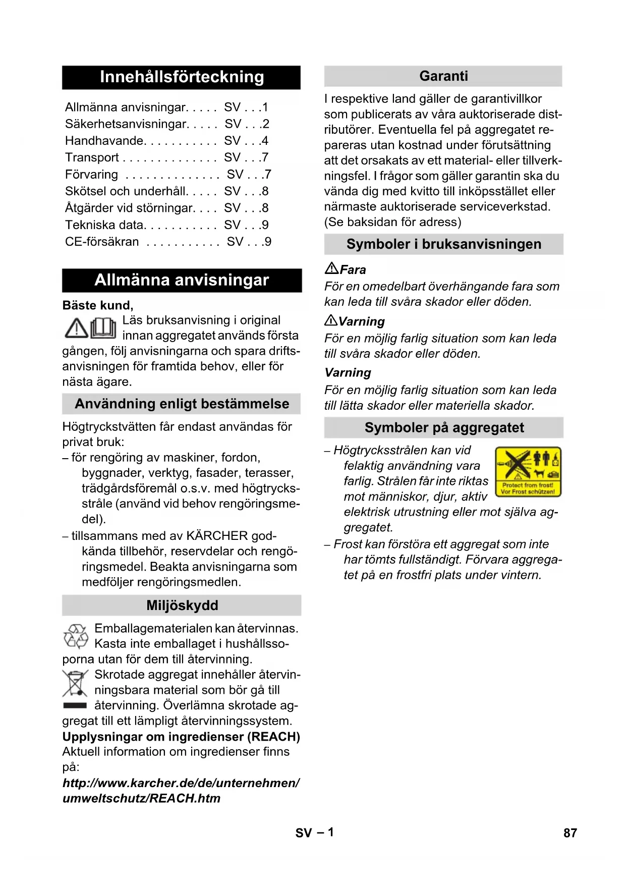 - SV Säkerhetsanvisningar p. 1