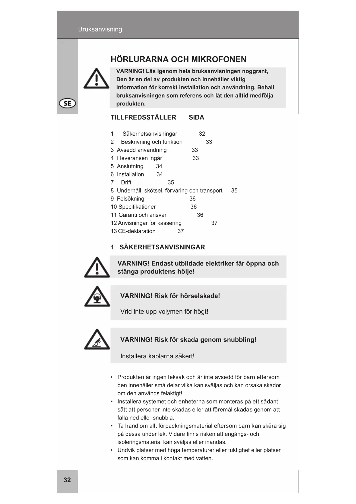- Undvikplatsermedhögatemperaturerellerfuktighetellerplatser somkankommaikontaktmedvatten. VARNING! Risk för skada genom snubbling! Installerakablarnasäkert! VARNING! Risk för hörselskada! Vridinteuppvolymenförhögt!33 2 BeSKRIVNING OCH FUNKTION Produktenärhörlurarförmultimedia.Skickaochtaemotljudmed stereohörlurarnaochdeninbyggdamikrofonen.Justeraproduktensåatt denpassarpådig.Produktenäravseddförtelefon-ochvideosamtal meddator,förspelochförattlyssnapåmusik. 3 AVSedd ANVÄNdNING Detärintetillåtetattanvändaenhetenpåandrasättände sombeskrivsikapitletBeskrivningochfunktion.Använd endastproduktenitorrautrymmeninomhus.Underlåtenhetattfölja dessabestämmelserochsäkerhetsanvisningarkanorsakadödsolycka, personskadorochskadorpåegendom. 4 I LeVeRANSeN INGåR