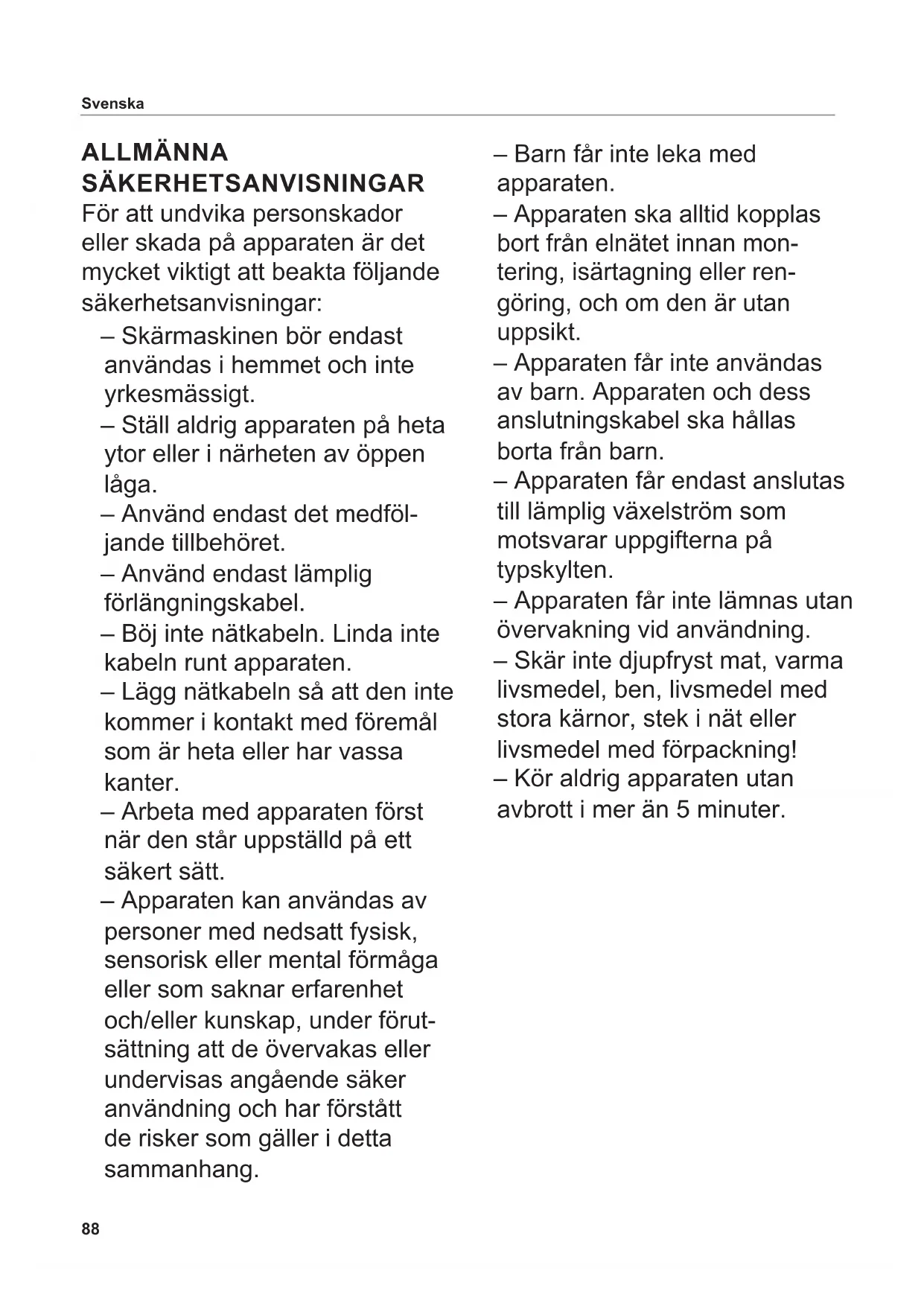 Симбол прецртане канте за отпатке на точковима указује на потребу за одвојеним прикупљањем. Погодно за контакт са храном. Уређај класе заштите II88 ALLMÄNNA SÄKERHETSANVISNINGAR För att undvika personskador eller skada på apparaten är det mycket viktigt att beakta följande säkerhetsanvisningar: – Skärmaskinen bör endast användas i hemmet och inte yrkesmässigt. – Ställ aldrig apparaten på heta ytor eller i närheten av öppen låga. – Använd endast det medföl- jande tillbehöret. – Använd endast lämplig förlängningskabel. – Böj inte nätkabeln. Linda inte kabeln runt apparaten. – Lägg nätkabeln så att den inte kommer i kontakt med föremål som är heta eller har vassa kanter. – Arbeta med apparaten först när den står uppställd på ett säkert sätt. – Apparaten kan användas av personer med nedsatt fysisk, sensorisk eller mental förmåga eller som saknar erfarenhet och/eller kunskap, under förut- sättning att de övervakas eller undervisas angående säker användning och har förstått de risker som gäller i detta sammanhang. – Barn får inte leka med apparaten. – Apparaten ska alltid kopplas bort från elnätet innan mon- tering, isärtagning eller ren- göring, och om den är utan uppsikt. – Apparaten får inte användas av barn. Apparaten och dess anslutningskabel ska hållas borta från barn. – Apparaten får endast anslutas till lämplig växelström som motsvarar uppgifterna på typskylten. – Apparaten får inte lämnas utan övervakning vid användning. – Skär inte djupfryst mat, varma livsmedel, ben, livsmedel med stora kärnor, stek i nät eller livsmedel med förpackning! – Kör aldrig apparaten utan avbrott i mer än 5 minuter. Svenska89 Risk för elstöt – Vid driftstörningar, före varje rengöring och när apparaten inte är i bruk ska stickkontak- ten alltid dras ut ur eluttaget. Dra då alltid i kontakten och inte i kabeln. – Doppa aldrig apparaten i vat- ten. Utsätt aldrig apparaten för regn eller annan fukt.Om apparaten ändå hamnar i vat- ten någon gång ska stickkon- takten först dras ut ur eluttaget och först därefter ska appara- ten tas upp ur vattnet. Lämna sedan in apparaten för över- syn på ett behörigt service- ställe innan den åter tas i bruk. – Använd inte apparaten med fuktiga händer. Använd den inte om den är fuktig eller våt eller om du står på ett fuktigt golv. Använd inte apparaten utomhus. – Ta apparaten genast ur bruk vid skador på dess delar och kontakta ritter kundtjänst. – Om nätkabeln skadas måste den bytas ut av tillverkaren, dess kundtjänst eller liknande behörig person för att undvika risker. Risk för personskada – Apparaten får inte användas utan matarvagn eller resthål- lare, såvida inte storleken eller formen på det som ska skivas gör det omöjligt att använda dessa. – Före byte av tillbehör eller extra delar som är rörliga vid bruk måste apparaten stängas av och skiljas från elnätet. – Klingan är mycket vass. – Rör aldrig klingan när appara- ten är i bruk! – Stäng av apparaten före ren- göring, dra ut stickkontakten ur eluttaget och vrid inställ- ningsvredet för skivtjocklek till läge ”0”. – Klingan fortsätter att rotera en stund efter avstängning. Svenska90 Slå upp bilderna på bokomsla- gets insida i början och slutet. Läs noga igenom anvisningen innan apparaten tas i bruk. Spara bruksanvisningen och skicka med den när apparaten lämnas vidare. Den aktuella bruksanvisningen står även till förfogande på www.ritterwerk.de. ANVÄNDNING Skärmaskinen används för att skära livsmedel som förekommer i hemmet. Skärmaskinen är lämplig för livsmedel. Ej avsett bruk eller felak- tig användning kan leda till svåra personskador eller skada på apparaten. I sådana fall gäller inga garanti- eller ansvarsanspråk.