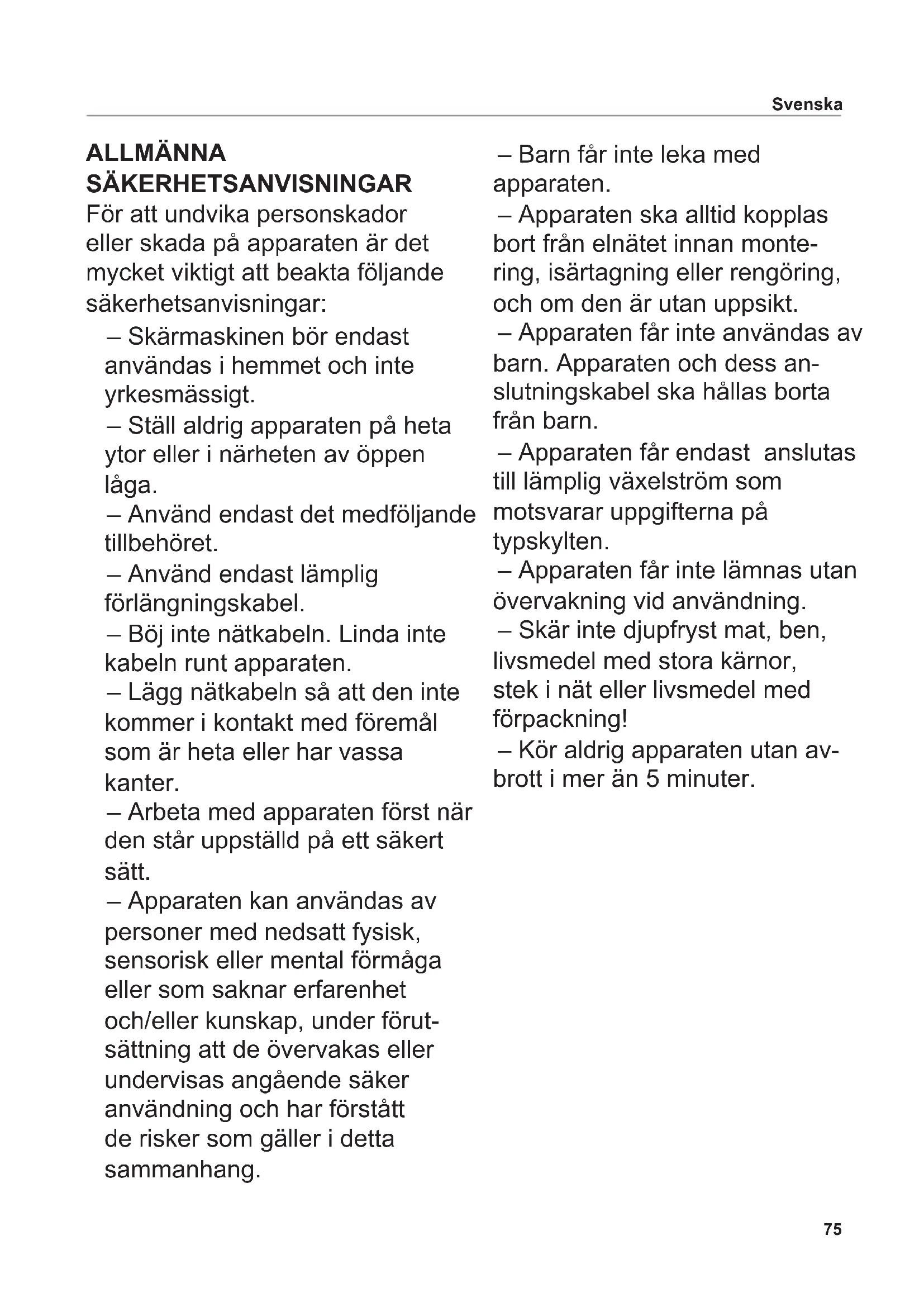 För att undvika personskador eller skada på apparaten är det mycket viktigt att beakta följande säkerhetsanvisningar: – Skärmaskinen bör endast användas i hemmet och inte yrkesmässigt. – Ställ aldrig apparaten på heta ytor eller i närheten av öppen låga. – Använd endast det medföljande tillbehöret. – Använd endast lämplig förlängningskabel. – Böj inte nätkabeln. Linda inte kabeln runt apparaten. – Lägg nätkabeln så att den inte kommer i kontakt med föremål som är heta eller har vassa kanter. – Arbeta med apparaten först när den står uppställd på ett säkert sätt. – Apparaten kan användas av personer med nedsatt fysisk, sensorisk eller mental förmåga eller som saknar erfarenhet och/eller kunskap, under förut- sättning att de övervakas eller undervisas angående säker användning och har förstått de risker som gäller i detta sammanhang. – Barn får inte leka med apparaten. – Apparaten ska alltid kopplas bort från elnätet innan monte- ring, isärtagning eller rengöring, och om den är utan uppsikt. – Apparaten får inte användas av barn. Apparaten och dess an- slutningskabel ska hållas borta från barn. – Apparaten får endast anslutas till lämplig växelström som motsvarar uppgifterna på typskylten. – Apparaten får inte lämnas utan övervakning vid användning. – Skär inte djupfryst mat, ben, livsmedel med stora kärnor, stek i nät eller livsmedel med förpackning! – Kör aldrig apparaten utan av- brott i mer än 5 minuter.76 Risk för elstöt – Vid driftstörningar, före varje rengöring och när apparaten inte är i bruk ska stickkontakten alltid dras ut ur eluttaget. Dra då alltid i kontakten och inte i kabeln. – Doppa aldrig apparaten i vat- ten. Utsätt aldrig apparaten för regn eller annan fukt. Om ap- paraten ändå hamnar i vatten någon gång ska stickkontakten först dras ut ur eluttaget och först därefter ska apparaten tas upp ur vattnet. Lämna sedan in apparaten för översyn på ett behörigt serviceställe innan den åter tas i bruk. – Använd inte apparaten med fuktiga händer. Använd den inte om den är fuktig eller våt eller om du står på ett fuktigt golv. Använd inte apparaten utomhus. – Ta apparaten genast ur bruk vid skador på dess delar och kontakta ritter kundtjänst. – Om nätkabeln skadas måste den bytas ut av tillverkaren, dess kundtjänst eller liknande behörig person för att undvika risker. Risk för personskada – Apparaten får inte användas utan matarvagn eller resthål- lare, såvida inte storleken eller formen på det som ska skivas gör det omöjligt att använda dessa. – Innan byte av tillbehör eller extra delar som är rörliga vid bruk måste apparaten stängas av och skiljas från elnätet. – Klingan är mycket vass. – Rör aldrig klingan när appara- ten är i bruk! – Stäng av apparaten innan rengöring, dra ut stickkontakten ur eluttaget och vrid inställ- ningsvredet för skivtjocklek till läge ”0”. – Klingan fortsätter att rotera en stund efter avstängning. Svenska77 Slå upp bilderna på bokomsla- gets insida i början och slutet. Läs noga igenom anvisningen innan apparaten tas i bruk. Spara bruksanvisningen och skicka med den när apparaten lämnas vidare. Den aktuella bruksanvisningen står även till förfogande på www.ritterwerk.de. ANVÄNDNING Skärmaskinen används för att skära livsmedel som förekommer i hemmet. Skärmaskinen är lämplig för livsmedel. Ej avsett bruk eller felaktig användning kan leda till svåra personskador eller skada på ap- paraten. I sådana fall gäller inga garanti eller ansvarsanspråk.