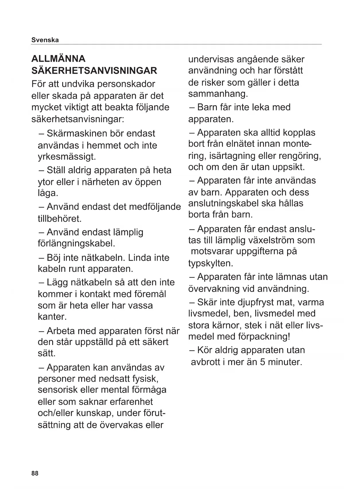 Симбол прецртане канте за отпатке на точковима указује на потребу за одвојеним прикупљањем. Погодно за контакт са храном Уређај класе заштите II88 Svenska ALLMÄNNA SÄKERHETSANVISNINGAR För att undvika personskador eller skada på apparaten är det mycket viktigt att beakta följande säkerhetsanvisningar: – Skärmaskinen bör endast användas i hemmet och inte yrkesmässigt. – Ställ aldrig apparaten på heta ytor eller i närheten av öppen låga. – Använd endast det medföljande tillbehöret. – Använd endast lämplig förlängningskabel. – Böj inte nätkabeln. Linda inte kabeln runt apparaten. – Lägg nätkabeln så att den inte kommer i kontakt med föremål som är heta eller har vassa kanter. – Arbeta med apparaten först när den står uppställd på ett säkert sätt. – Apparaten kan användas av personer med nedsatt fysisk, sensorisk eller mental förmåga eller som saknar erfarenhet och/eller kunskap, under förut- sättning att de övervakas eller undervisas angående säker användning och har förstått de risker som gäller i detta sammanhang. – Barn får inte leka med apparaten. – Apparaten ska alltid kopplas bort från elnätet innan monte