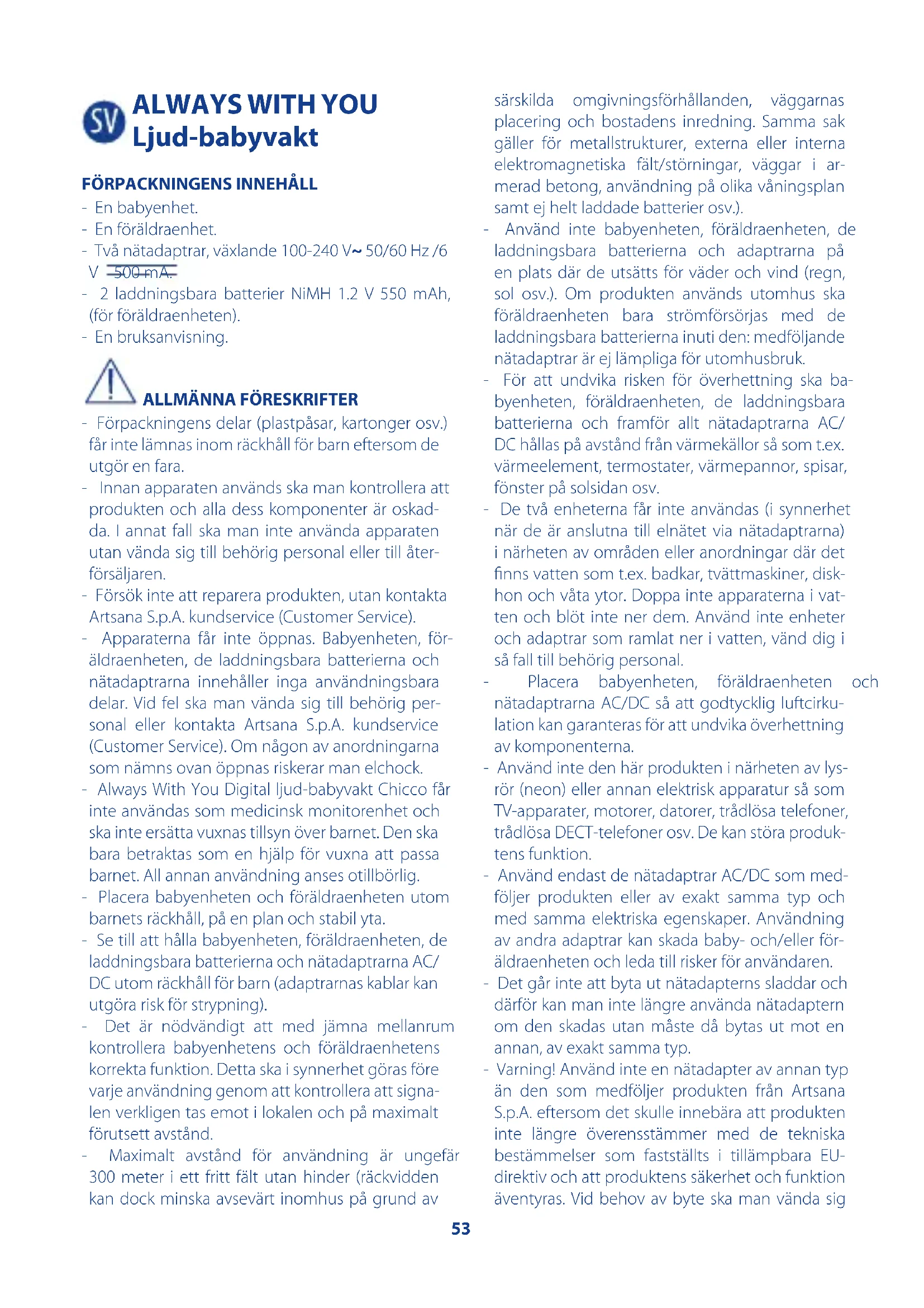 - Förpackningens delar (plastpåsar, kartonger osv.) får inte lämnas inom räckhåll för barn eftersom de utgör en fara. - Innan apparaten används ska man kontrollera att produkten och alla dess komponenter är oskad- da. I annat fall ska man inte använda apparaten utan vända sig till behörig personal eller till åter- försäljaren. - Försök inte att reparera produkten, utan kontakta Artsana S.p.A. kundservice (Customer Service). - Apparaterna får inte öppnas. Babyenheten, för- äldraenheten, de laddningsbara batterierna och nätadaptrarna innehåller inga användningsbara delar. Vid fel ska man vända sig till behörig per- sonal eller kontakta Artsana S.p.A. kundservice (Customer Service). Om någon av anordningarna som nämns ovan öppnas riskerar man elchock. - Always With You Digital ljud-babyvakt Chicco får inte användas som medicinsk monitorenhet och ska inte ersätta vuxnas tillsyn över barnet. Den ska bara betraktas som en hjälp för vuxna att passa barnet. All annan användning anses otillbörlig. - Placera babyenheten och föräldraenheten utom barnets räckhåll, på en plan och stabil yta. - Se till att hålla babyenheten, föräldraenheten, de laddningsbara batterierna och nätadaptrarna AC/ DC utom räckhåll för barn (adaptrarnas kablar kan utgöra risk för strypning). - Det är nödvändigt att med jämna mellanrum kontrollera babyenhetens och föräldraenhetens korrekta funktion. Detta ska i synnerhet göras före varje användning genom att kontrollera att signa- len verkligen tas emot i lokalen och på maximalt förutsett avstånd. - Maximalt avstånd för användning är ungefär 300 meter i ett fritt fält utan hinder (räckvidden kan dock minska avsevärt inomhus på grund av särskilda omgivningsförhållanden, väggarnas placering och bostadens inredning. Samma sak gäller för metallstrukturer, externa eller interna elektromagnetiska fält/störningar, väggar i ar- merad betong, användning på olika våningsplan samt ej helt laddade batterier osv.). - Använd inte babyenheten, föräldraenheten, de laddningsbara batterierna och adaptrarna på en plats där de utsätts för väder och vind (regn, sol osv.). Om produkten används utomhus ska föräldraenheten bara strömförsörjas med de laddningsbara batterierna inuti den: medföljande nätadaptrar är ej lämpliga för utomhusbruk. - För att undvika risken för överhettning ska ba- byenheten, föräldraenheten, de laddningsbara batterierna och framför allt nätadaptrarna AC/ DC hållas på avstånd från värmekällor så som t.ex. värmeelement, termostater, värmepannor, spisar, fönster på solsidan osv. - De två enheterna får inte användas (i synnerhet när de är anslutna till elnätet via nätadaptrarna) i närheten av områden eller anordningar där det nns vatten som t.ex. badkar, tvättmaskiner, disk- hon och våta ytor. Doppa inte apparaterna i vat- ten och blöt inte ner dem. Använd inte enheter och adaptrar som ramlat ner i vatten, vänd dig i så fall till behörig personal. - Placera babyenheten, föräldraenheten och nätadaptrarna AC/DC så att godtycklig luftcirku- lation kan garanteras för att undvika överhettning av komponenterna. - Använd inte den här produkten i närheten av lys- rör (neon) eller annan elektrisk apparatur så som TV-apparater, motorer, datorer, trådlösa telefoner, trådlösa DECT-telefoner osv. De kan störa produk- tens funktion. - Använd endast de nätadaptrar AC/DC som med- följer produkten eller av exakt samma typ och med samma elektriska egenskaper. Användning av andra adaptrar kan skada baby- och/eller för- äldraenheten och leda till risker för användaren. - Det går inte att byta ut nätadapterns sladdar och därför kan man inte längre använda nätadaptern om den skadas utan måste då bytas ut mot en annan, av exakt samma typ. - Varning! Använd inte en nätadapter av annan typ än den som medföljer produkten från Artsana S.p.A. eftersom det skulle innebära att produkten inte längre överensstämmer med de tekniska bestämmelser som fastställts i tillämpbara EU- direktiv och att produktens säkerhet och funktion äventyras. Vid behov av byte ska man vända sig54 till återförsäljaren eller Artsana S.p.A. - Försäkra dig om att spänningen på nätadaptrarna AC/DC (se etiketten på adaptrarna) överensstäm- mer med den i ditt elnät och att kontakten på nätadaptrarna är kompatibel med eluttagen i ditt elsystem. - Anslut nätadaptrarna AC/DC till eluttag som är lätta att komma åt men som är utom räckhåll för barn. Placera adaptrarnas kablar så att man inte kan trampa på sladdarna, så att inga föremål placerade ovanför eller intill kan fasta i sladdarna och så att inte barn kan komma åt sladdarna och därmed hamna i fara (snubbla, bli strypta). - Nätadaptrarna AC/DC, babyenheten och föräldra- enheten kan kännas varma vid beröring när de är i funktion. Detta är normalt. - Koppla alltid bort nätadaptrarna AC/DC från elut- taget när apparaten inte används. - De laddningsbara batterierna får bara bytas ut av en vuxen person och mot laddningsbara batte- rier med samma egenskaper som de som anges i denna bruksanvisning. VARNING! FÖR ATT UNDVIKA RISKEN FÖR ELSTÖT FÅR MAN INTE AVLÄGSNA SKYDDET EL- LER FÖRSÖKA ÖPPNA NÄTADAPTRARNA. BLÖT INTE NER NÄTADAPTRARNA, BABYENHETEN OCH FÖRÄLDRAENHETEN, UTSÄTT DEM INTE FÖR FUKT OCH FÖRSÖK INTE ÖPPNA DEM. DETTA KAN LEDA TILL FARA OCH ATT GARANTIN UPPHÖR ATT GÄLLA.