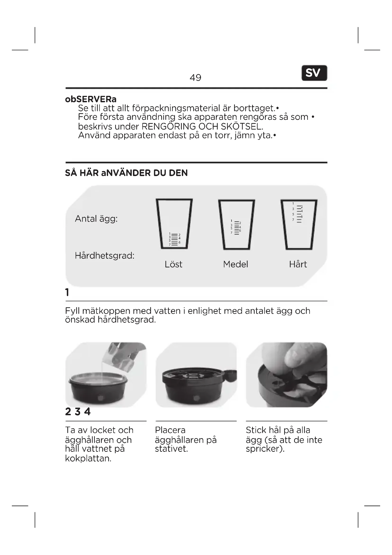 obSERVERa SÅ HÄR aNVÄNDER DU DEN Se till att allt förpackningsmaterial är borttaget.• Före första användning ska apparaten rengöras så som • beskrivs under RENGÖRING OCH SKÖTSEL. Använd apparaten endast på en torr, jämn yta.• Fyll mätkoppen med vatten i enlighet med antalet ägg och önskad hårdhetsgrad. Antal ägg: Hårdhetsgrad: