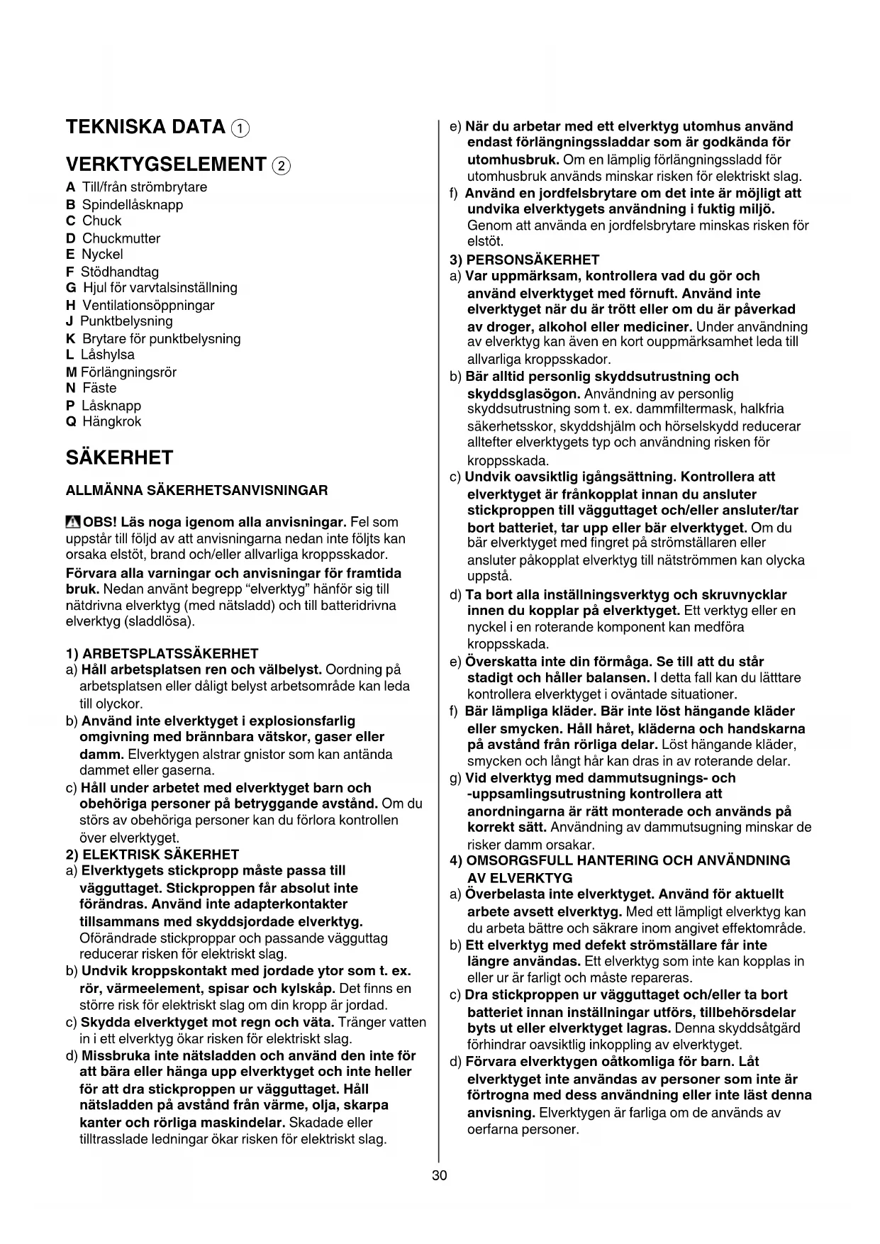 - Läs och spara denna instruktionsbok 330 TEKNISKA DATA 1 VERKTYGSELEMENT 2 A Till/från strömbrytare B Spindellåsknapp C Chuck D Chuckmutter E Nyckel F Stödhandtag G Hjul för varvtalsinställning H Ventilationsöppningar J Punktbelysning K Brytare för punktbelysning L Låshylsa M Förlängningsrör N Fäste P Låsknapp Q Hängkrok SÄKERHET