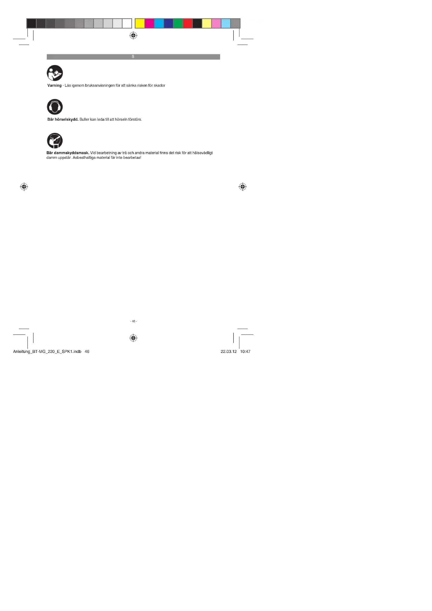 Varning - Läs igenom bruksanvisningen för att sänka risken för skador Bär hörselskydd. Buller kan leda till att hörseln förstörs. Bär dammskyddsmask. Vid bearbetning av trä och andra material fi nns det risk för att hälsovådligt damm uppstår. Asbesthaltiga material får inte bearbetas! Anleitung_BT-MG_220_E_SPK1.indb 46Anleitung_BT-MG_220_E_SPK1.indb 46 22.03.12 10:4722.03.12 10:47S