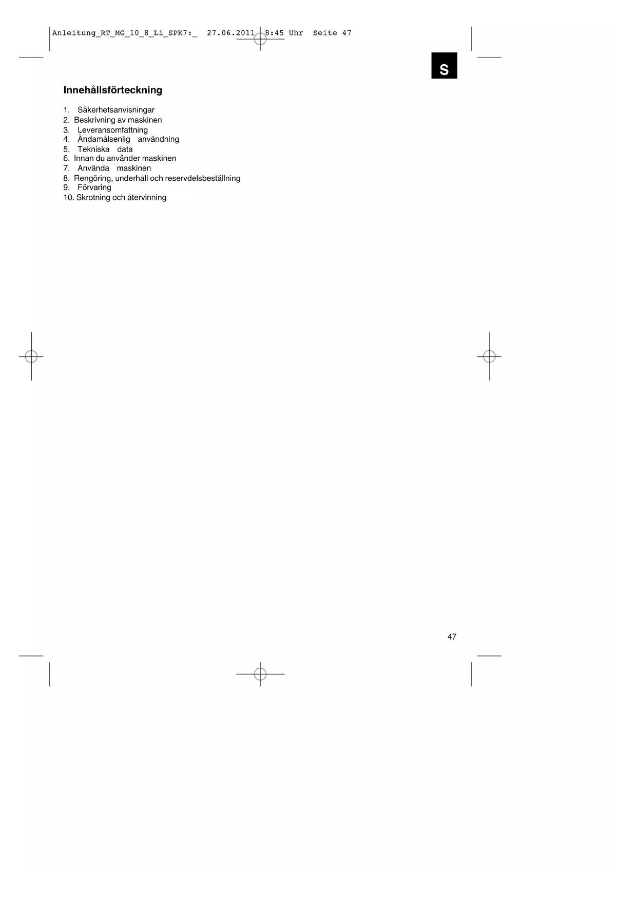 skick till adressen som anges nedan. Bifoga kvittot i original eller ett annat daterat köpebevis. Förvara därför kassakvittot på en säker plats! Beskriv orsaken till reklamationen så noggrant som möjligt. Om defekten i produkten täcks av våra garantitjänster, får du genast en reparerad eller ny apparat av oss. Givetvis kan vi även, mot debitering, åtgärda skador som antingen inte täcks av garantin eller som har uppstått efter garantitidens slut. Skicka in produkten till nedanstående serviceadress. Anleitung_RT_MG_10_8_Li_SPK7:_ 27.06.2011 8:45 Uhr Seite 9495