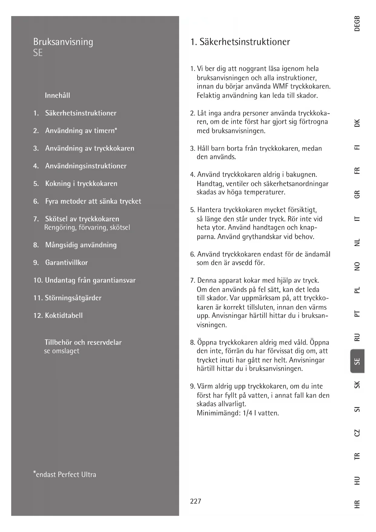 HR232 För högt tryck regleras automatiskt via huvud- ventilen (se stycke 5.4. Koktider). Koppla in timern (12) i lockhandtaget (5) och ställ in* den önskade koktiden. Värm upp tryck- kokaren på högsta energisteget. Genom uppkok- ningsautomatiken (4), som samtidigt fungerar som säkerhetsventil, strömmar under uppkok- ningsfasen luft ut, tills ventilen stängs hörbart, och trycket kan byggas upp i grytan. Den röda indikatorn (24) i timern (12) signalerar, att gry- tan då inte längre kan öppnas*. Koksignalen (1) börjar stiga uppåt. Uppstigningen kan iakttas genom ursparningen bredvid koksignalen (I), och energitillförseln kan då justeras i rätt tid. Timern (12) signalerar akustiskt (3 korta ljud), att det inställda koksteget är nått. Då börjar nedräkningen av den inställda koktiden (V)* 5.4. Koktider Timern (12) signalerar koktidens början*. Var uppmärksam på, att ringpositionen på koksigna- len (1) håller sig stabil. Reglera energitillförseln på motsvarande sätt. Om koksignalen (1) sjunker under den rätta orangefärgade kokringen, måste värmetillförseln ökas igen. Därigenom blir koktiden något längre. Stiger koksignalen (1) över det inställda kokste- get (30c)/(30d), uppstår ett för högt ångtryck, som via huvudventilen (3) framme på lockhand- taget (5) pyser ut hörbart. Ta då omedelbart bort grytan från spisplattan, och vänta tills kok- signalen (1) har sjunkit ner till respektive kok- ring; därefter kan tryckkokaren ställas tillbaka på spisen med nedskruvad värme. De korta koktiderna med tryckkokaren blir möj- liga, eftersom temperaturerna i grytan blir högre genom ångtrycket. Första ring, ca 110 °C (45 kPa arbetstryck, 90 kPa regleringstryck) för ömtåliga maträtter såsom fisk och kom- pott Andra ring, ca 119 °C (95 kPa arbetstryck, 130 kPa regleringstryck, max 150 kPa) för alla övriga maträtter Energimedvetna personer stänger av kokplat- tan redan innan koktiden har gått ut, eftersom den i grytan ackumulerade värmen är tillräcklig för att slutföra kokningen. Tillagningstiderna för samma maträtt kan vara olika, eftersom mängd, form och livsmedlens beskaffenhet varierar. 5.5. Hänvisning för induktionsspisar TransTherm®-universalbottnen (11) är lämplig för alla spistyper, även för induktionsspisar. Vid induktionsspisar kan man vid höga koksteg höra ett summande ljud. Detta ljud har tekniska orsa- ker och är inget tecken på någon defekt på din spis eller på tryckkokaren. Grytbottnens diame- ter måste stämma överens med kokplattans dia- meter, i annat fall kan det hända – i synnerhet vid små diametrar – att kokplattan (magnetfäl- tet) inte reagerar på grytans botten 5.6. Att öppna grytan Timern (12) signalerar akustiskt (med 5 korta ljud), att koktiden har gått ut; om du inte stänger av, upprepas signalen fyra gånger. Du kan stänga av ljudet, om du kort trycker på plus- eller minusknappen (25)/(26)*. Du har fyra möjligheter att sänka trycket i gry- tan – se nästa sida. Principiellt får locket endast öppnas och tas bort från grytan, om trycket är helt borta. Det ser man på, att indikatorn (24) i timern (12) *endast Perfect Ultra233 växlar från rött till grönt (blinkande) (W)*. Dess - utom måste koksignalen (1) helt ha försvunnit i handtaget (5) (J). Lyser den röda indikatorn (24) i timern (12)*, fastän koksignalen (1) har försvunnit helt i gry- tan, verkar den så kallade resttrycksäkringen. Lossa den genom att flytta fram vridknappen (8) ännu en gång och därefter dra den tillbaka (A). Skaka grytan kort, innan du öppnar den. På så sätt försvinner de eventuellt kvarvarande ång- blåsor, som särskilt i flytande och grötliknande maträtter kan bildas och stänka ut, när locket tas bort. Vrid därefter lockhandtaget (5) som beskrivet åt höger och lyft bort locket uppåt