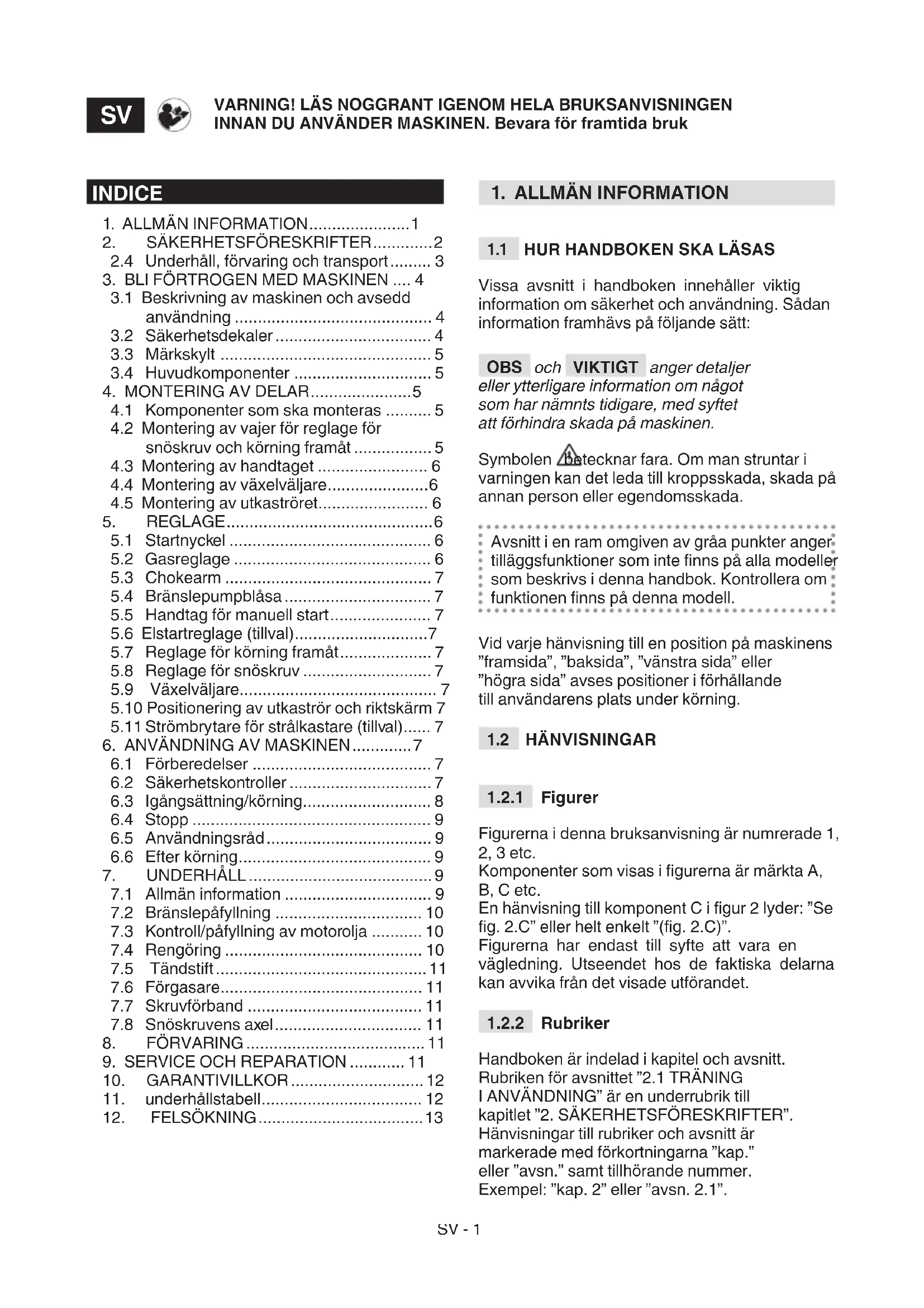 Handboken är indelad i kapitel och avsnitt. Rubriken för avsnittet ”2.1 TRÄNING I ANVÄNDNING” är en underrubrik till kapitlet ”2. SÄKERHETSFÖRESKRIFTER”. Hänvisningar till rubriker och avsnitt är markerade med förkortningarna ”kap.” eller ”avsn.” samt tillhörande nummer. Exempel: ”kap. 2” eller ”avsn. 2.1”. VARNING! LÄS NOGGRANT IGENOM HELA BRUKSANVISNINGEN INNAN DU ANVÄNDER MASKINEN. Bevara för framtida bruk