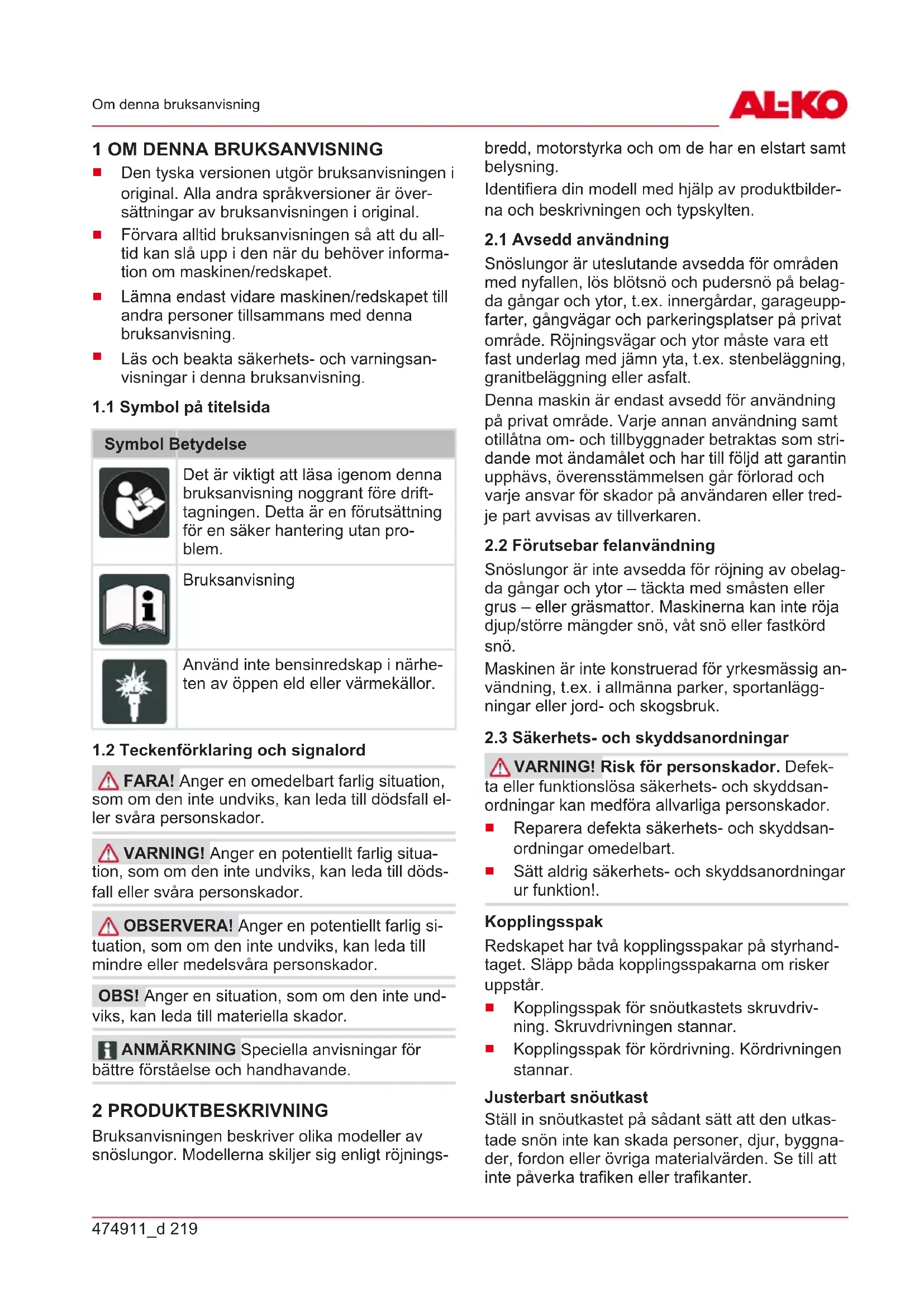 FARA! Anger en omedelbart farlig situation, som om den inte undviks, kan leda till dödsfall el- ler svåra personskador. VARNING! Anger en potentiellt farlig situa- tion, som om den inte undviks, kan leda till döds- fall eller svåra personskador. OBSERVERA! Anger en potentiellt farlig si- tuation, som om den inte undviks, kan leda till mindre eller medelsvåra personskador. OBS! Anger en situation, som om den inte und- viks, kan leda till materiella skador. ANMÄRKNING Speciella anvisningar för bättre förståelse och handhavande. 2 PRODUKTBESKRIVNING Bruksanvisningen beskriver olika modeller av snöslungor. Modellerna skiljer sig enligt röjnings- bredd, motorstyrka och om de har en elstart samt belysning. Identifiera din modell med hjälp av produktbilder- na och beskrivningen och typskylten.
