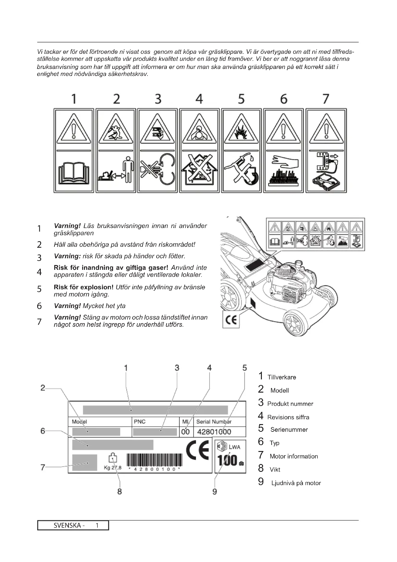 Varning! Läs bruksanvisningen innan ni använder gräsklipparen Håll alla obehöriga på avstånd från riskområdet! Varning: risk för skada på händer och fötter. Risk för inandning av giftiga gaser! Använd inte apparaten i stängda eller dåligt ventilerade lokaler. Risk för explosion! Utför inte påfyllning av bränsle med motorn igång. Varning! Mycket het yta Varning! Stäng av motorn och lossa tändstiftet innan något som helst ingrepp för underhåll utförs. Vi tackar er för det förtroende ni visat oss genom att köpa vår gräsklippare. Vi är övertygade om att ni med tillfreds- ställelse kommer att uppskatta vår produkts kvalitet under en lång tid framöver. Vi ber er att noggrannt läsa denna bruksanvisning som har till uppgift att informera er om hur man ska använda gräsklipparen på ett korrekt sätt i enlighet med nödvändiga säkerhetskrav. 1 Tillverkare 2 Modell 3 Produkt nummer 4 Revisions siffra 5 Serienummer 6 Typ 7 Motor information 8 Vikt 9 Ljudnivå på motorSVENSKA - SÄKERHETSNORMER