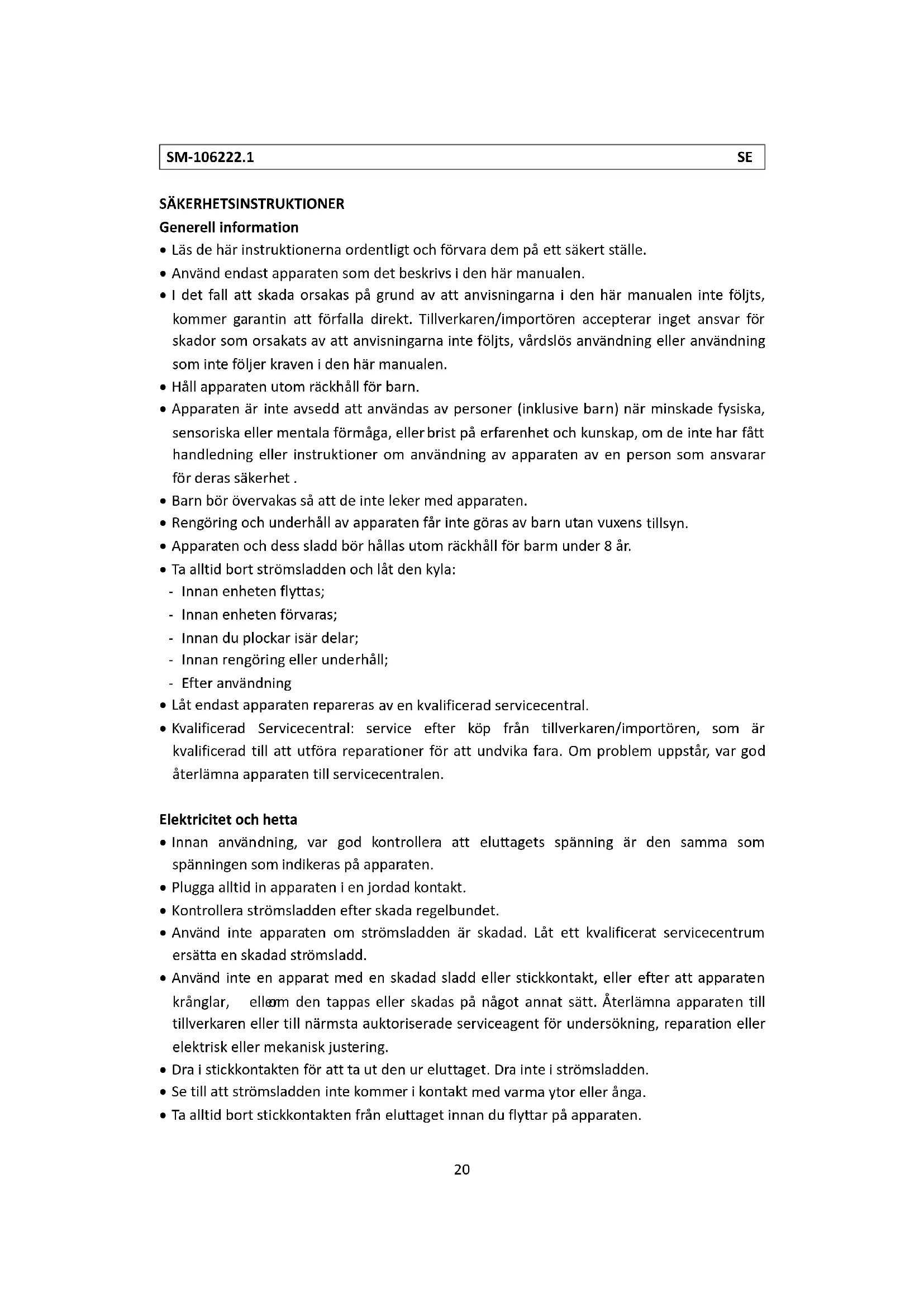 - Apparaten ar inte avsedd att användas av personer (inklusive barn) nar minskade fysiska, sensoriska eller mentala formåga, eller brist på erfarenhet och kunskap, om de inte har fätt handledning erler instruktioner om användning av apparaten av en person som ansvarar För deras sakerhet.