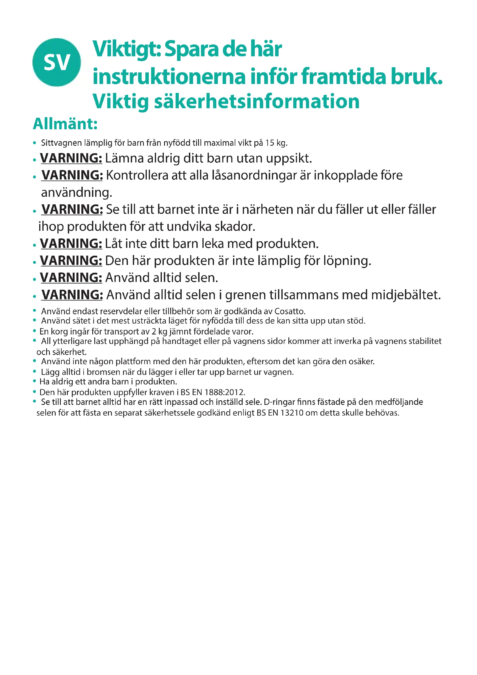 Din sittvagn är designad för att uppfylla omfattande säkerhetsstandarder och med rätt användning och skötsel kommer den att ge dig många år av problemfri användning.