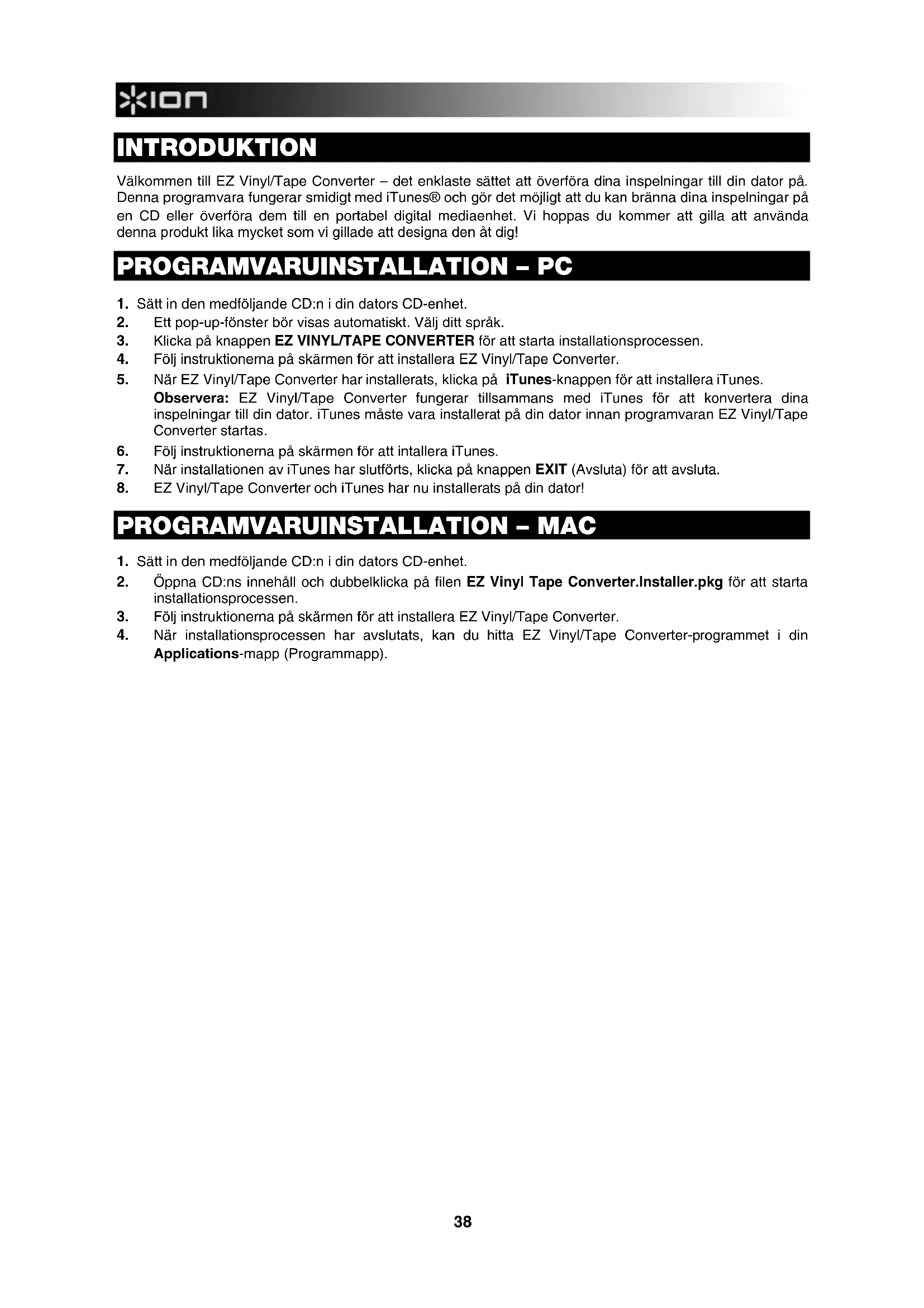 Fråga: Vilka operativsystem är EZ Vinyl/Tape Converter kompatibel med? Svar: EZ Vinyl/Tape Converter är för närvarande kompatibel med operativsystemen Windows XP, Vista och 7 (32-bitars eller 64-bitars, samt med operativsystemet Mac OS X 10.4.11 (eller högre). Fråga: Till vilket digitalt format konverteras mina inspelningar till? Svar: Inspelningarna konverteras till MP3-filer och till det bitvärde som valts i Import Settings (Impotera inställningar) i iTunes. För att visa/ändra dessa inställningar i iTunes, klicka på menyn Edit (Redigera) och välj Preferences (Preferenser) och välj sedan fliken General (Allmänt) och klicka på knappen Import Settings (Importera inställningar). Klicka på rullgardinsmenyn Import Using (Importera med) och välj MP3 Encoder (MP3-avkodare). Nu kan du välja önskat antal bitar under rullgardingsmenyn Setting (Inställning). Fråga: Vart lagras mina inspelningar på datorn? Svar: Dina inspelningar lagras i iTunes musikmapp (Music folder). Som standard finns denna mapp i My Documents (Mina dokument) My Music iTunes iTunes Music på Windows OS, eller i Music iTunes iTunes Music på Mac OS och innehållet är organiserat efter Artist. Fråga: Hur bränner jag mina inspelningar på en CD? Svar: Det finns olika sätt som du kan bränna dina inspelningar på en CD på. Du kan antingen använda iTunes eller ett annat CD-brännarprogram. För att bränna en CD med iTunes, skapa en ny Playlist (Spellista) och dra låtarna från ditt vanliga bibliotek till denna spellista. När du har lagt till de låtar som du vill ha, klicka på spellistan och på knappen Burn Disc (Bränn CD). Hänvisa till iTunes hjälpmeny (eller ditt alternativa program) för mer information. Fråga: Kan jag lyssna på musiken på min dator när jag spelar in? Svar: Ja. EZ Vinyl/Tape Converter spelar automatiskt upp inkommande ljud genom din dator när musiken överförs. Om du använder flera ljudenheter, rekommenderar vi att du avaktiverar de enheter som du inte vill använda som monitorer. För de flesta användare är detta inte något problem.www.ionaudio.com