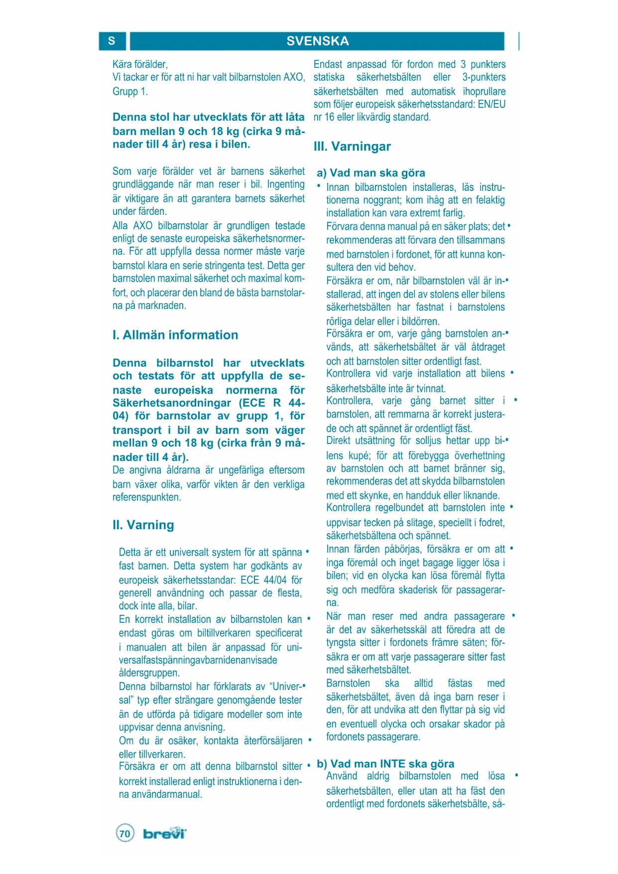 Ladda ner instruktionerna för din Bilbarnstol i PDF-format gratis! Hitta din manual Axo - Brevi och ta tillbaka ditt elektroniska enhet i hand. På denna sida publiceras alla dokument som behövs för att använda din enhet. Axo av märket Brevi.