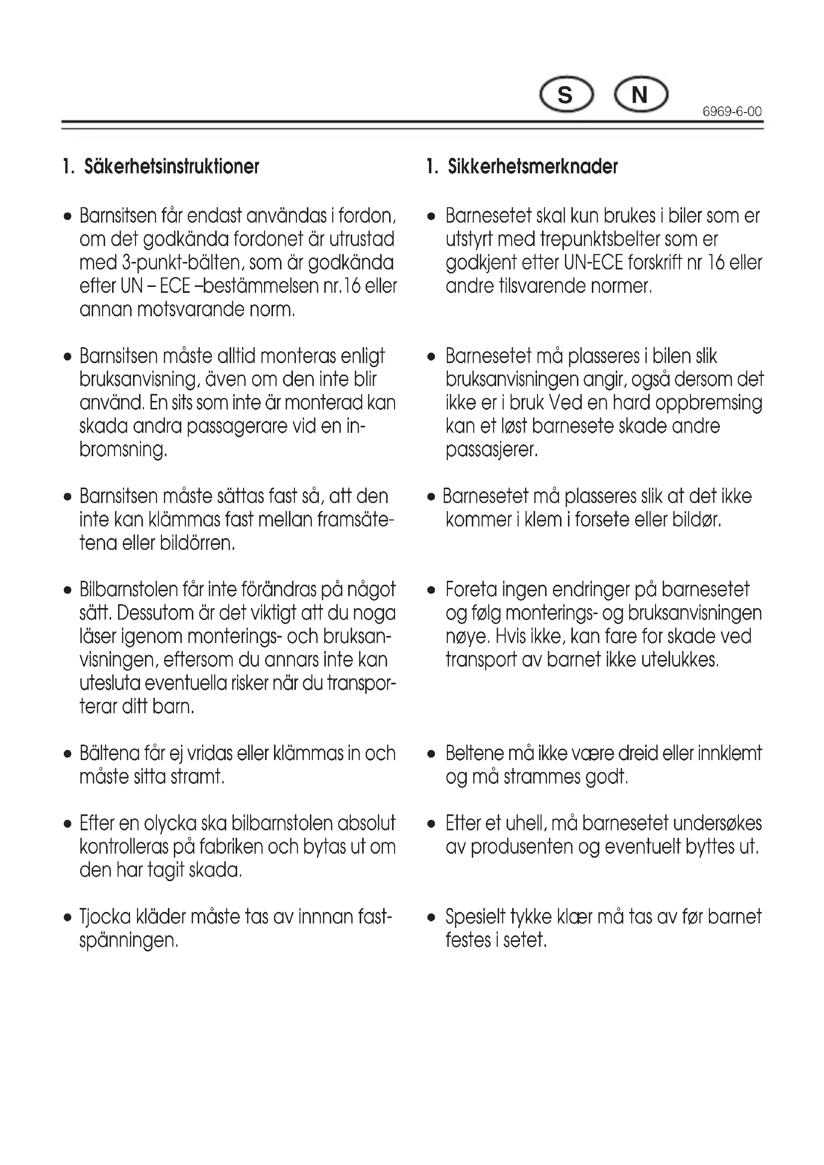 Endast lamplig att anvanda i bilar, som ar utrustade med ECE-regel nr.16 godkandt 3-punkt sakerhetsbalte ell er after annan likartad standard. Detta ar en sits viktklass II och III for barn med en kroppsvikt mellan 15 och 36kg . Denna monterings-och bruksanvisning maste lamnas over till kunden.