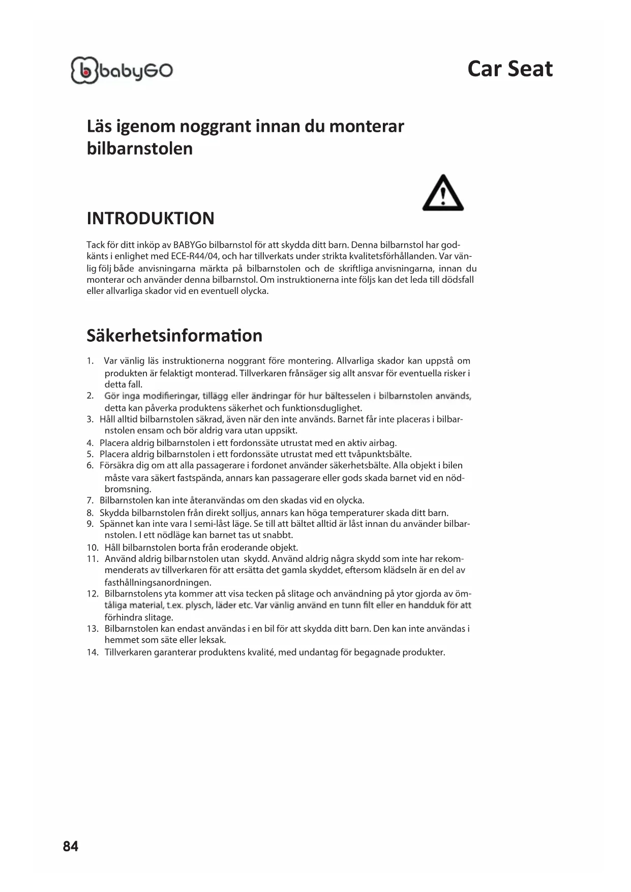 INTRODUKTION Tack för ditt inköp av BABYGo bilbarnstol för att skydda ditt barn. Denna bilbarnstol har god- känts i enlighet med ECE-R44/04, och har tillverkats under strikta kvalitetsförhållanden. Var vän- lig följ både anvisningarna märkta på bilbarnstolen och de skriftliga anvisningarna, innan du monterar och använder denna bilbarnstol. Om instruktionerna inte följs kan det leda till dödsfall eller allvarliga skador vid en eventuell olycka. Säkerhetsinformaon