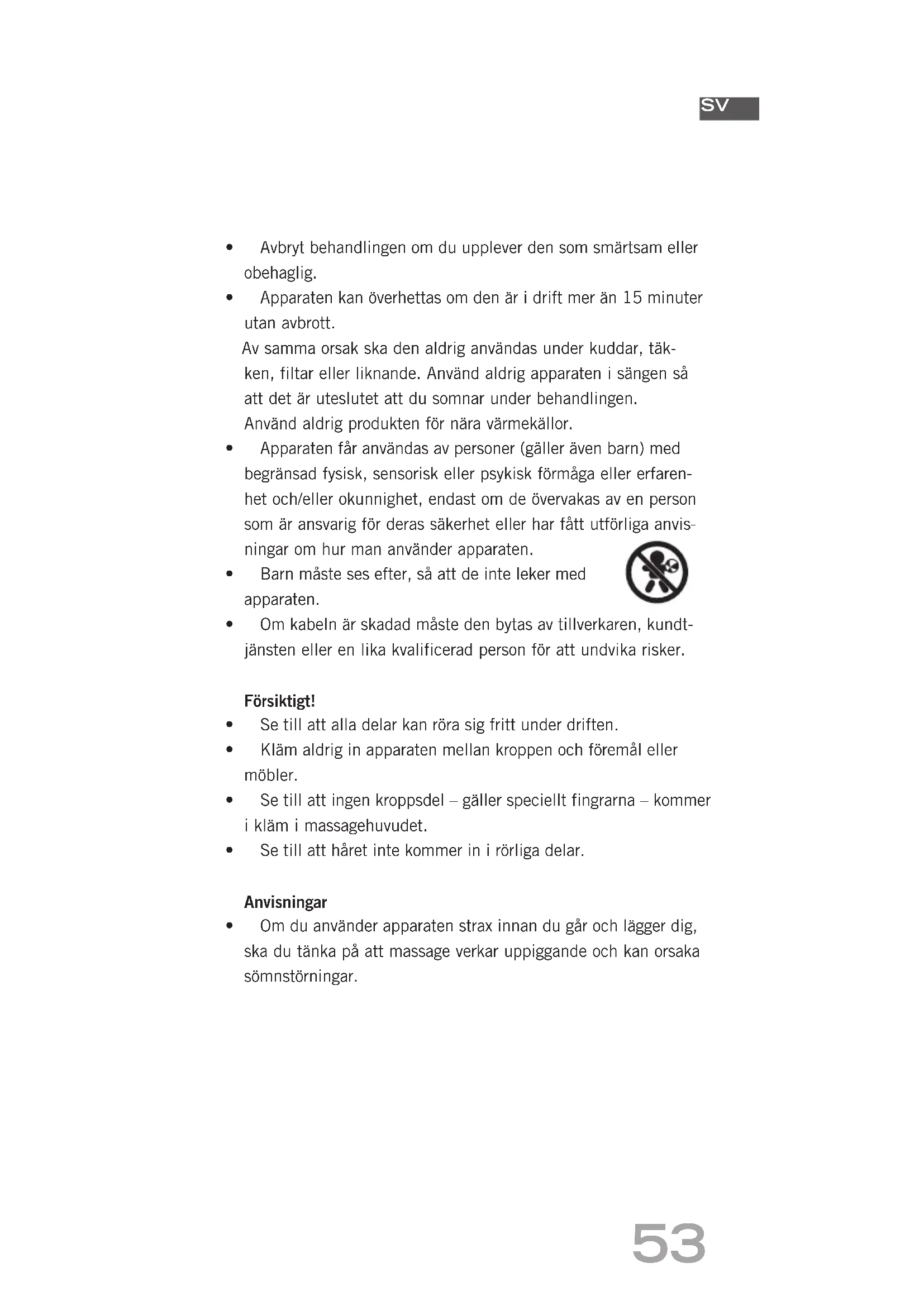 Vi tackar dig för att du har köpt den här apparaten. Med den här massageapparaten kan du massera dig själv eller andra personer. Massage i vid bemärkelse är en av människans äldsta behand- lingsmetoder. Massage med den här apparaten verkar avslappn- ande och stimulerande och har visat sig nyttigt vid behandling av träningsvärk, spänningar, cirkulationsstörningar och trötthet. Apparaten är ingen ersättning, utan bara en komplettering till läkarbehandling eller sjukgymnastik. Fråga din läkare om du inte är säker på om denna massageapparaten är lämplig för dig. Massageapparaten är inte avsedd för medicinsk eller kommersiell användning. Läs bruksanvisningen noga så att du kan utnyttja alla fördelarna med massageapparaten på bästa sätt och beakta säkerhetsanvis- ningarna, då kommer du länge att ha nytta och glädje av din massageapparat. Spara bruksanvisningen för framtida frågor. Ytterligare information finns på vår hemsida www.soehnle.com.52
