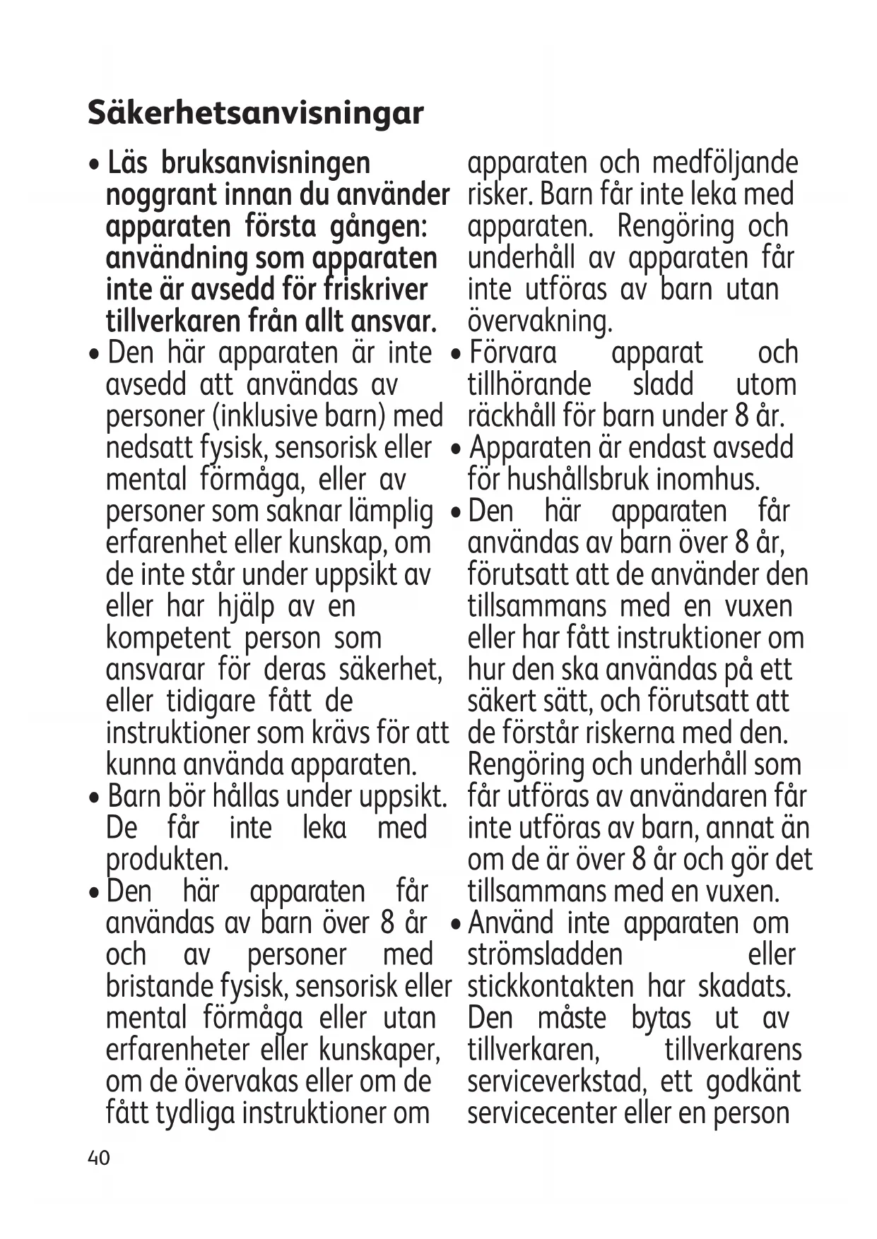 - Den här apparaten får användas av barn över 8 år och av personer med bristande fysisk, sensorisk eller mental förmåga eller utan erfarenheter eller kunskaper, om de övervakas eller om de fått tydliga instruktioner om apparaten och medföljande risker. Barn får inte leka med apparaten. Rengöring och underhåll av apparaten får inte utföras av barn utan övervakning.