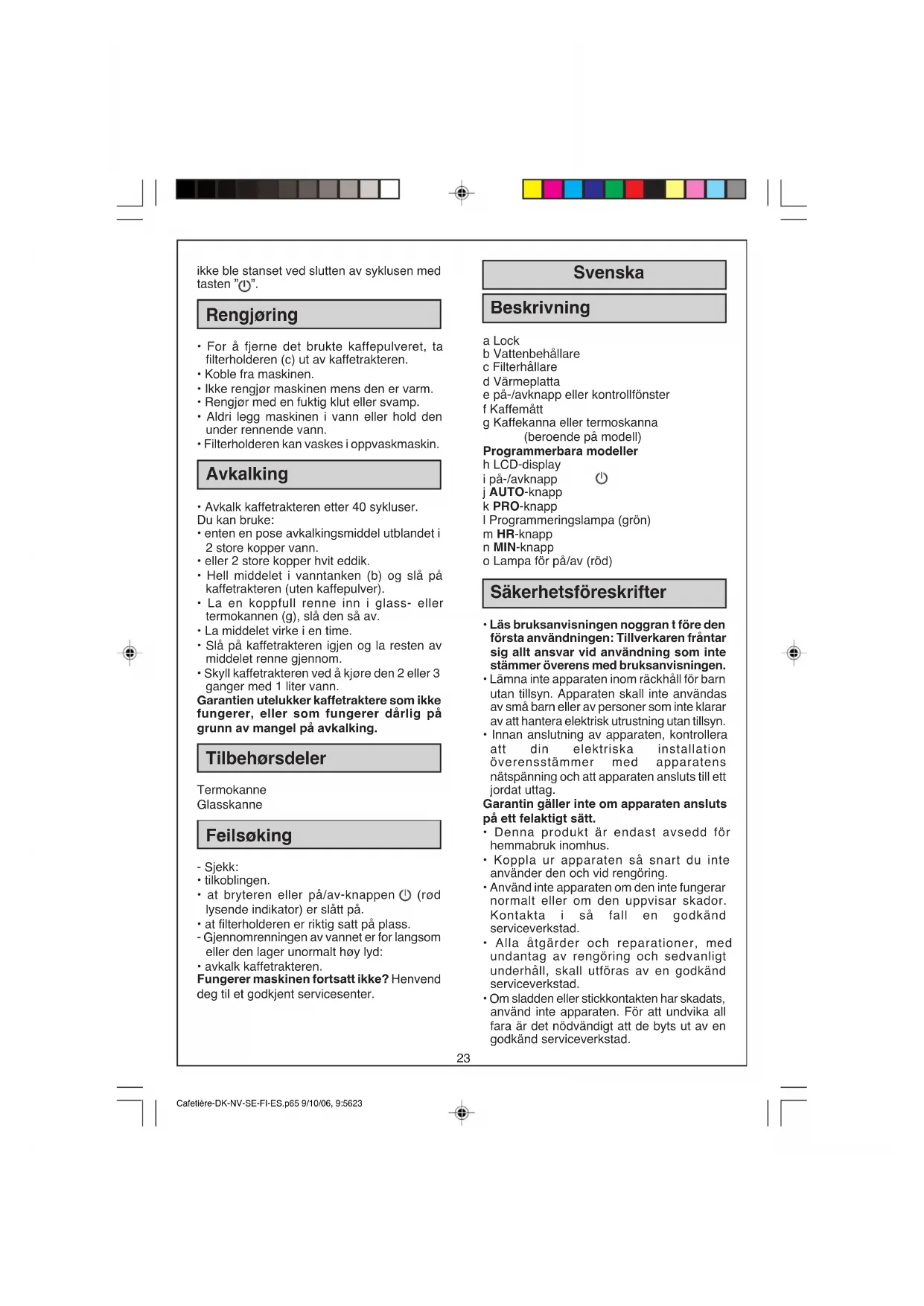 - För optimal varmhållning, skölj termoskannan med hett vatten före användning. Cafetière-DK-NV-SE-FI-ES.p65 9/10/06, 9:562425 Anmärkning för båda lägena: Kaffebryggaren stängs automatiskt av efter två timmar om du inte har stängt av den med knappen " " när kaffet är färdigbryggt. Rengöring