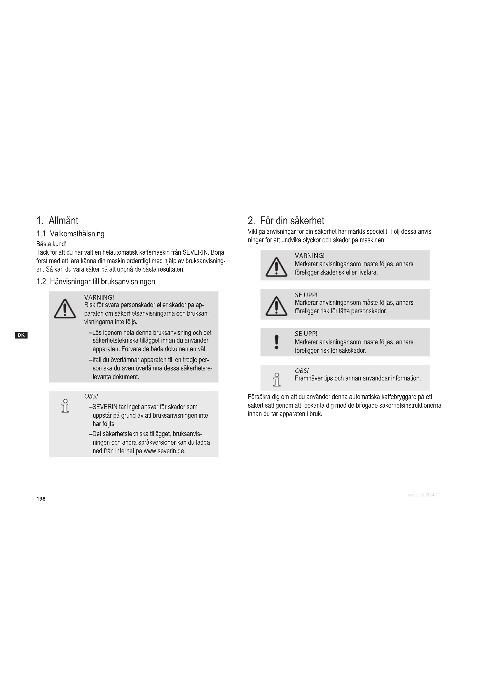 Viktiga anvisningar för din säkerhet har märkts speciellt. Följ dessa anvis- ningar för att undvika olyckor och skador på maskinen: VARNING! Markerar anvisningar som måste följas, annars föreligger skaderisk eller livsfara. SE UPP! Markerar anvisningar som måste följas, annars föreligger risk för lätta personskador. SE UPP! Markerar anvisningar som måste följas, annars föreligger risk för sakskador. OBS! Framhäver tips och annan användbar information. Försäkra dig om att du använder denna automatiska kaffebryggare på ett säkert sätt genom att bekanta dig med de bifogade säkerhetsinstruktionerna innan du tar apparaten i bruk.197 Version 2 2014-11