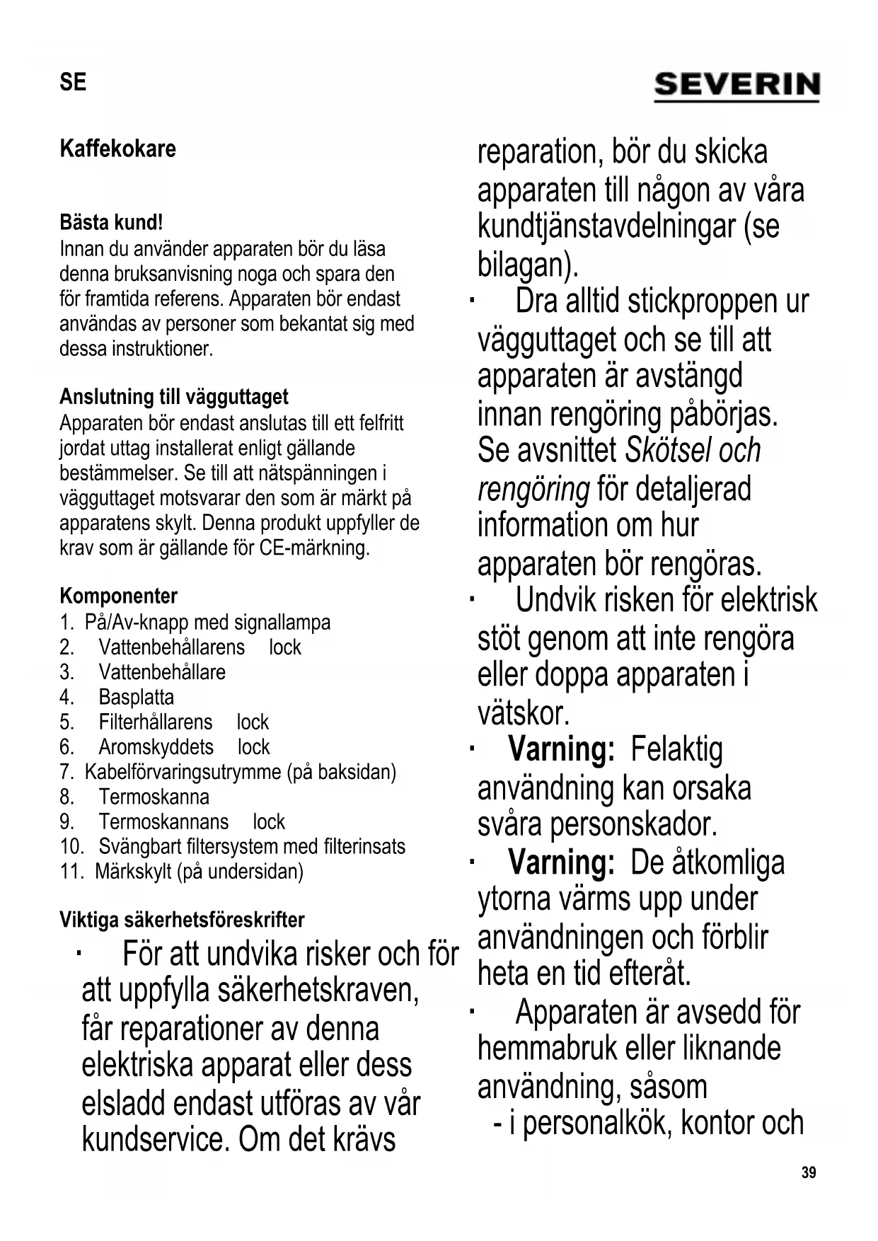 Tryck på på/av-knappen; signallampan tänds och uppvärmningsprocessen startar. Då vattenbehållaren är maximalt fylld börjar vattnet koka om ca 5 minuter. ∙ När den optimala bryggningstemperaturen har uppnåtts öppnas ventilen och bryggningsprocessen börjar. ∙ Vapotronic-systemet stänger av uppvärmningsprocessen automatiskt. ∙ Kaffet börjar rinna igenom fi ltret till termoskannan. ∙ Signallampan slocknar då fi ltreringsomgången är klar. ∙ Du kan avbryta bryggningsprocessen genom att trycka på på/av-knappen igen. ∙ Lyft bort kannan från basplattan. ∙ Tag bort aromskyddslocket och ersätt den med kannans skruvlock. ∙ Det färdigbryggda kaffet kan hällas upp utan att du tar av skruvlocket. ∙ Häll upp kaffet genom att helt enkelt vrida skruvlocket ett halvt varv motsols. Vrid tillbaka locket igen efter att du hällt upp kaffet. ∙ Skulle behov fi nnas att starta många omgångar efter varandra, kom ihåg att vattenbehållaren fortfarande är varm.42 Tillåt apparaten kallna i 5 min. innan den kopplas på. Den kan endast fungera om behållaren har fått tillfälle att bli något svalare. Varning: Kom ihåg att vattenbehållaren och locket ännu är heta efter att bryggningsomgången är färdig och att het ånga kan utges när du öppnar locket (risk för skållning). Termoskanna ∙ Av tekniska skäl sluter locket inte helt tätt, se därför till att kannan hålls i upprätt position när den är fylld med kaffe. ∙ Håll kaffet varmt: En termoskanna ackumulerar värmeenergi. Det är därför bättre att fylla den helt. Om den bara är delvis fylld blir inte varmhållningen tillfredsställande. Om kannan sköljs med varmvatten innan användning hålls kaffet varmt längre. Sladdförvaring I kabelförvaringsutrymmet förvarar du sladden och begränsar också dess längd om du använder den lägre delen av öppningen. Skötsel och rengöring ∙ Dra alltid stickproppen ur vägguttaget och se till att apparaten är avstängd innan rengöring påbörjas. ∙ Undvik risken för elektrisk stöt genom att inte rengöra eller doppa apparaten i vätskor. Kaffekokaren kan avtorkas med en lätt fuktad trasa och ett milt diskmedel kan användas. Torka torrt efteråt. Se upp så att inte ludd blir kvar i vattenbehållaren efter rengöring. Detta kan då täppa till vattenbehållarens ventil nästa gång vattnet kokas. ∙ Använd inte slipmedel eller starka rengöringslösningar. ∙ Avlägsna kaffesumpen genom att öppna den svängbara fi lterhållaren, tag bort locket och lyft ut fi lterinsatsen. Kasta bort kaffesumpen; den är ett naturligt ämne och kan därför sättas i komposten. ∙ Skruva inte isär termoskannan, diska den inte i diskmaskin och doppa den heller inte i vatten. ∙ Skölj insidan av termoskannan, torka av yttersidan med en ren mjuk trasa efter användningen. ∙ För att avlägsna avlagringar inne i termoskannan fyller du kannan med varmt vatten och lägger i en sked med maskindiskpulver. Skruva på locket och låt kannan stå några timmar. Skölj noga med varmt vatten. ∙ Skruvlocket, aromskyddslocket, fi lterinsatsen och fi lterhållarens lock kan diskas i rent diskvatten; skölj noga efteråt under rinnande kran. Avkalkning ∙ Beroende på vattenkvaliteten (kalkinnehållet) på din hemort samt på apparatens användningstäthet, behöver alla apparater som används med varmt vatten avkalkas (dvs kalkavlagringar avlägsnas) regelbundet för att fungera ordentligt. Garantikrav godtas inte om apparaten inte fungerar på grund av otillräcklig avkalkning. ∙ Avkalkning är nödvändig när ni märker: ∙ att det tar längre tid än normalt att brygga kaffe, ∙ att avlagringar byggts upp inuti vattenbehållaren eller på ventilen, ∙ att vattenbehållarens ventil börjar läcka.43 ∙ En alltför stor kalkavlagring är mycket svår att avlägsna, trots att avkalkningsmedel används. Den kan också orsaka läckage i bryggningssystemet. Vi rekommenderar därför att apparaten avkalkas efter var trettionde eller fyrtionde bryggningsomgång. För avkalkning kan följande ättiksblandning användas: ∙ Blanda 2-3 matskedar ättiksyra med 250 ml kallt vatten. ∙ Häll avkalkningslösningen i vattenbehållaren, sätt ett fi lter i fi lterhållaren utan att tillsätta malet kaffe enligt avsnittet Så brygger du kaffe och låt apparaten genomföra en fi ltreringsomgång. Upprepa proceduren vid behov. Under avkalkningen bör du vädra tillräckligt och inte andas in ättiksångorna. ∙ För att rengöra apparaten efter avkalkningen bör du låta den göra 2-3 fi ltreringsomgångar med rent vatten. ∙ Häll inte ut avkalkningsmedlet i emaljerade tvättställen. Avfallshantering Enheter märkta med denna symbol måste kasseras separat från hushållsavfallet, eftersom de innehåller värdefulla material som kan återvinnas. Korrekt avfallshantering skyddar miljön och människors hälsa. Din lokala myndighet eller återförsäljare kan ge information i ärendet. Garanti i Sverige och Finland För material- och tillverkningsfel gäller 5 års garanti räknat från inköpsdagen mot uppvisande av specifi cerat inköpskvitto i överensstämmelse med de allmänna garantivillkoren. Denna garanti inverkar inte på dina lagstadgade rättigheter eller dina lagenliga rättigheter enligt den nationella konsumentskyddslagstiftningen. Ifall apparaten används felaktigt, eller vårdslöst, ansvarar den som använder apparaten för eventuella material- och personskador. Tillverkas för: Severin Elektrogeräte GmbH, Tyskland. Om fel uppstår... … när bryggningen tar längre tid än normalt, … när ventilen i vattenbehållaren börjar läcka, … när apparaten startats utan vatten i vattenbehållaren, avkalka vattenbehållaren (se ”Avkalkning”). … när hett vatten kommer upp ur locket till vattenbehållaren, … när ventilen inte öppnas trots att vattnet kokar, vattenbehållaren (3) har överfyllts. När du fyller vattenbehållaren bör du vara n