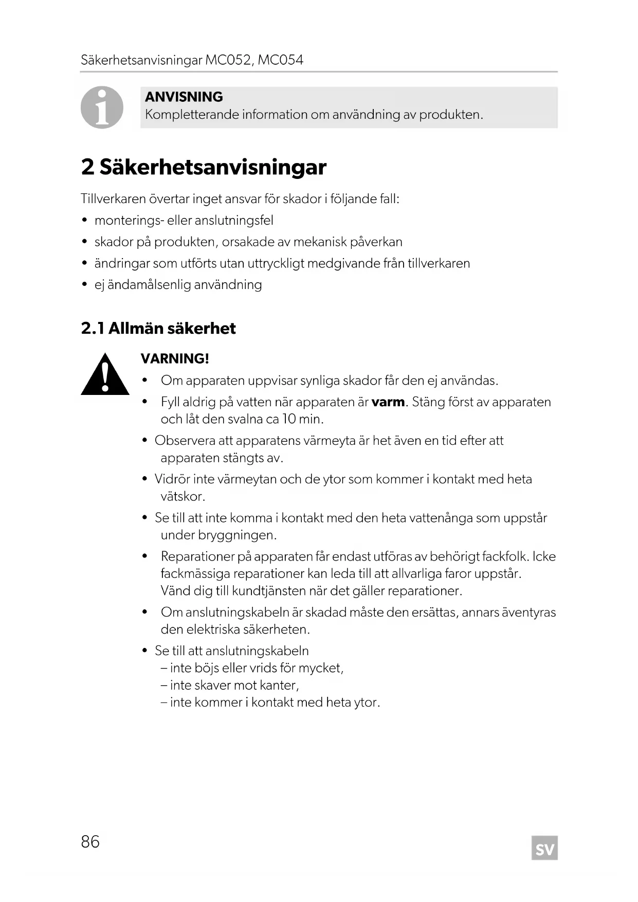 - Se till att anslutningskabeln – inte böjs eller vrids för mycket, – inte skaver mot kanter, – inte kommer i kontakt med heta ytor. ANVISNING Kompletterande information om användning av produkten. MC052-MC054-IO-16.book Seite 86 Donnerstag, 25. August 2016 11:50 11SV MC052, MC054 Säkerhetsanvisningar