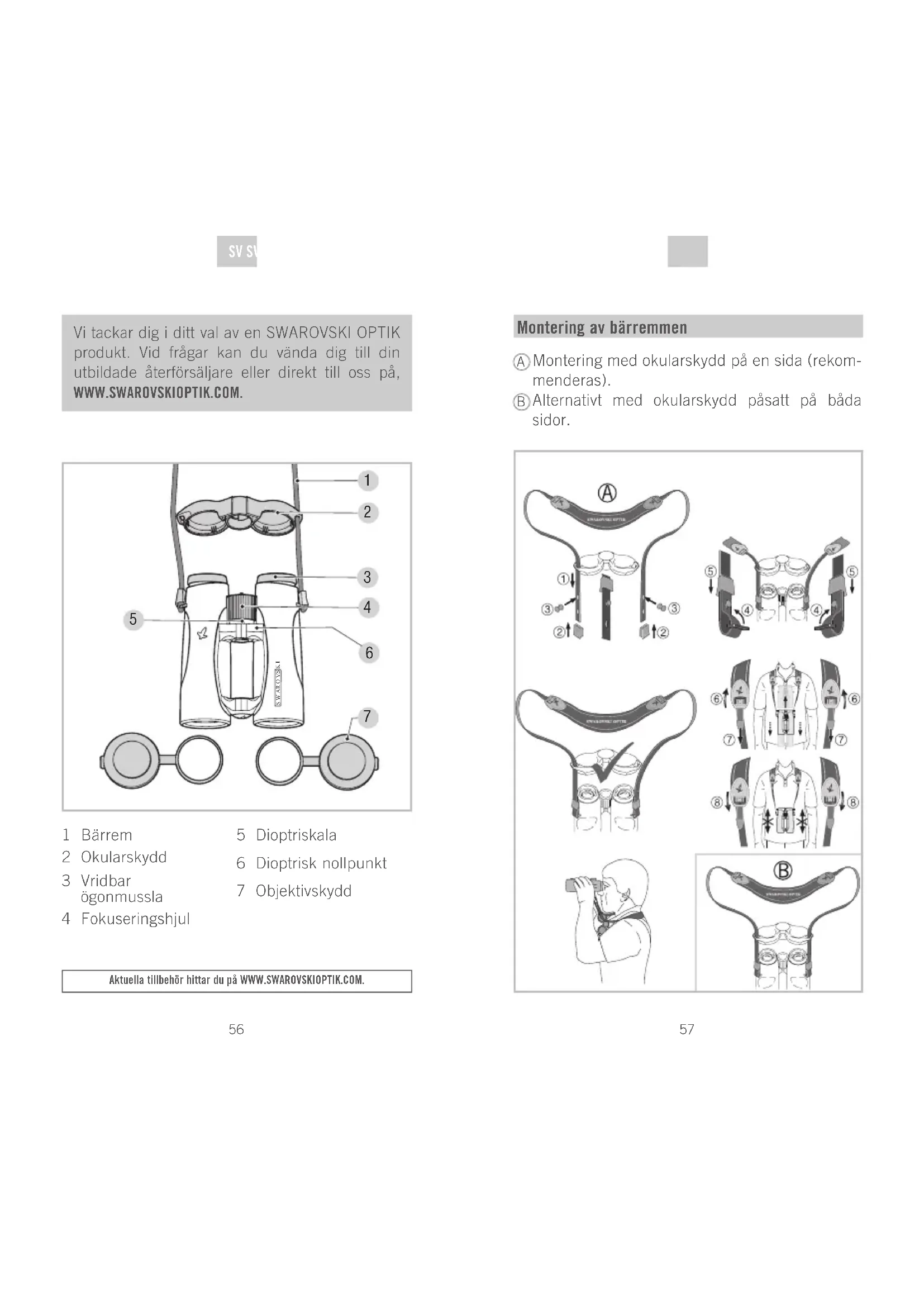 Vi tackar dig i ditt val av en SWAROVSKI OPTIK produkt. Vid frågar kan du vända dig till din utbildade återförsäljare eller direkt till oss på, WWW.SWAROVSKIOPTIK.COM. Aktuella tillbehör hittar du på WWW.SWAROVSKIOPTIK.COM. 1 Bärrem 2 Okularskydd 3 Vridbar ögonmussla 4 Fokuseringshjul 5 Dioptriskala 6 Dioptrisk nollpunkt 7 Objektivskydd SV SV