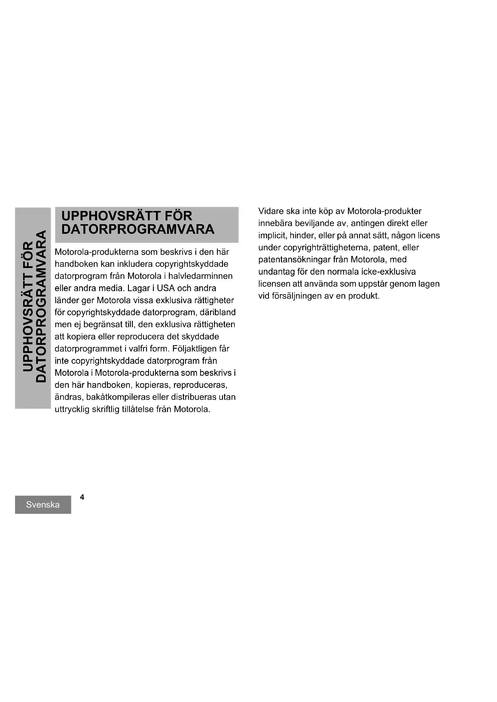 DATORPROGRAMVARA Motorola-produkterna som beskrivs i den här handboken kan inkludera copyrightskyddade datorprogram från Motorola i halvledarminnen eller andra media. Lagar i USA och andra länder ger Motorola vissa exklusiva rättigheter för copyrightskyddade datorprogram, däribland men ej begränsat till, den exklusiva rättigheten att kopiera eller reproducera det skyddade datorprogrammet i valfri form. Följaktligen får inte copyrightskyddade datorprogram från Motorola i Motorola-produkterna som beskrivs i den här handboken, kopieras, reproduceras, ändras, bakåtkompileras eller distribueras utan uttrycklig skriftlig tillåtelse från Motorola. Vidare ska inte köp av Motorola-produkter innebära beviljande av, antingen direkt eller implicit, hinder, eller på annat sätt, någon licens under copyrighträttigheterna, patent, eller patentansökningar från Motorola, med undantag för den normala icke-exklusiva licensen att använda som uppstår genom lagen vid försäljningen av en produkt.5 SÄKERHET Svenska SÄKERHET
