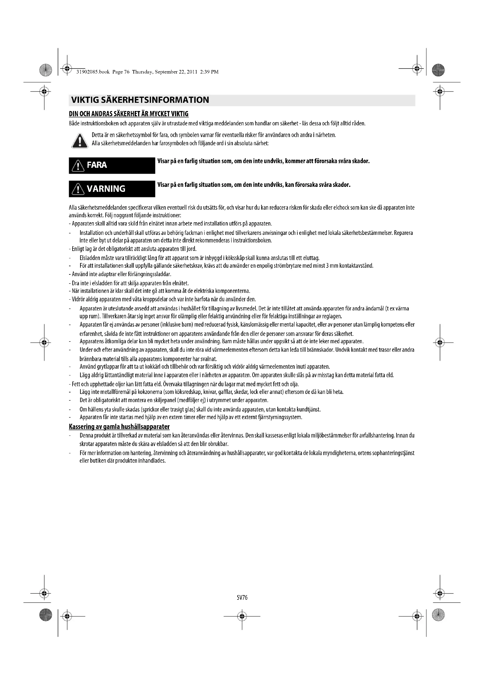 Detta är en säkerhetssymbol för fara, och symbolen varnar för eventuella risker för användaren och andra i närheten. Alla säkerhetsmeddelanden har farosymbolen och följande ord i sin absoluta närhet: FARA Visar på en farlig situation som, om den inte undviks, kommer att förorsaka svåra skador. VARNING Visar på en farlig situation som, om den inte undviks, kan förorsaka svåra skador. SVENSKA InstallationSida2Bruksanvisning Sida 31902085.book Page 76 Thursday, September 22, 2011 2:39 PMSV77 Kassering av förpackningsmaterialet Förpackningsmaterialet kan återvinnas till 100%, vilket framgår av återvinningssymbolen ( ). Hantera inte förpackningsmaterialet vårdslöst, utan ta ditt ansvar och sortera och kassera det enligt de anvisningar som finns vid återvinningscentralen. Kassering av apparaten Denna apparat är märkt enligt EG-direktiv 2002/96/EG beträffande elektriskt och elektroniskt avfall (Waste Electrical and Electronic Equipment, WEEE). Genom att säkerställa en korrekt skrotning av denna apparat bidrar du till att förhindra eventuella negativa konsekvenser för vår miljö och vår hälsa. Symbolen på apparaten och på de dokument som medföljer apparaten visar att denna apparat inte får skrotas som hushållsavfall, utan skall lämnas in på miljöstation för återvinning av elektroniska apparater. Energibesparing För att få bästa resultat, rekommenderar vi följande: