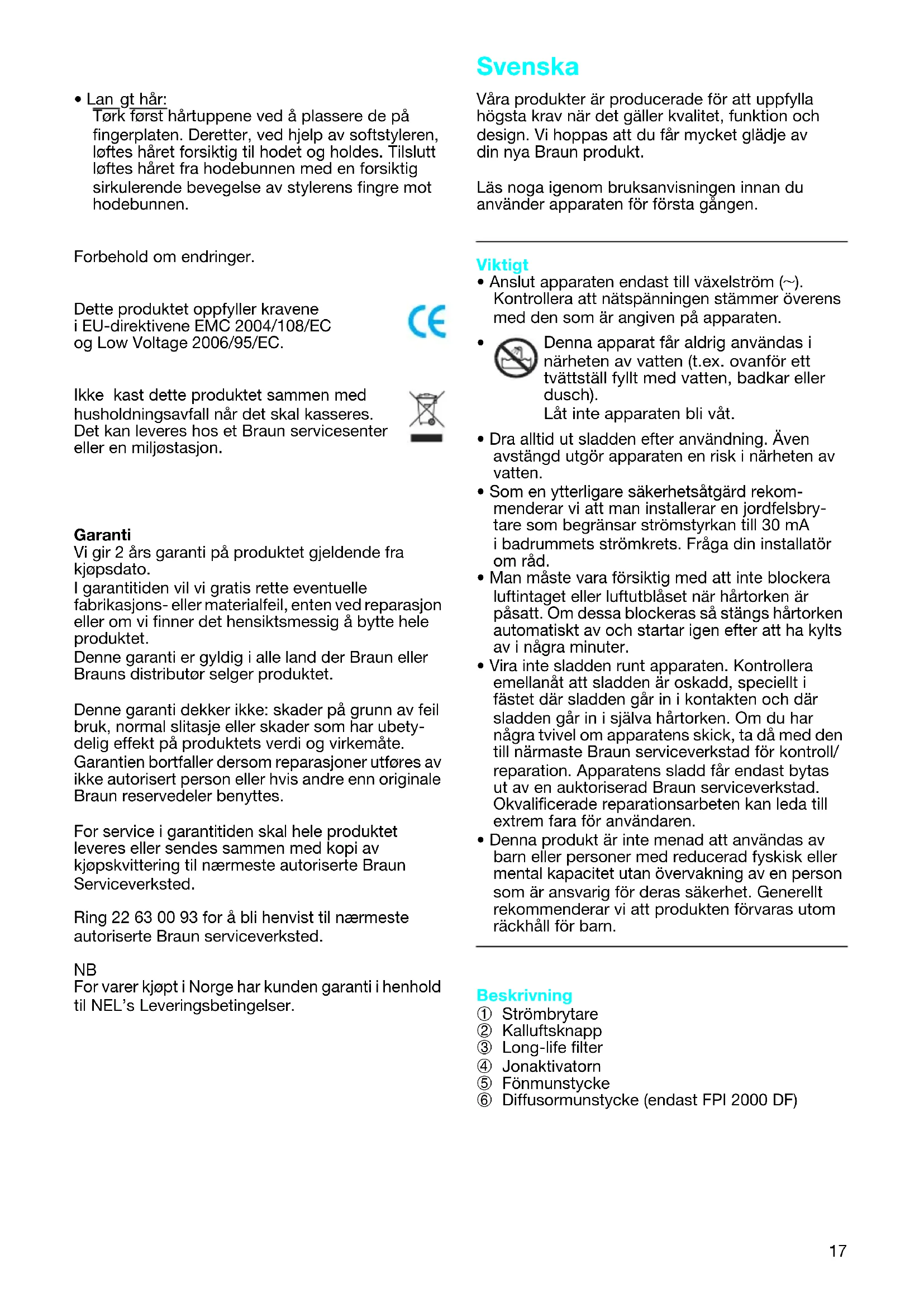 For varer kjøpt i Norge har kunden garanti i henhold til NEL’s Leveringsbetingelser. Våra produkter är producerade för att uppfylla högsta krav när det gäller kvalitet, funktion och design. Vi hoppas att du får mycket glädje av din nya Braun produkt. Läs noga igenom bruksanvisningen innan du använder apparaten för första gången. Viktigt