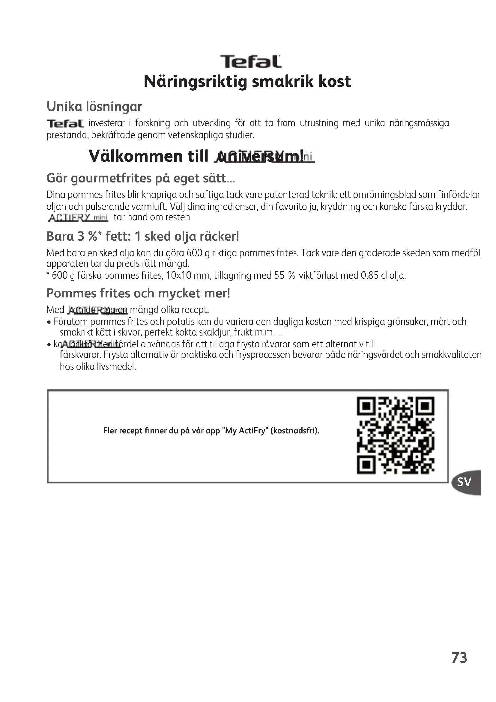 Näringsriktig smakrik kost Unika lösningar investerar i forskning och utveckling för att ta fram utrustning med unika näringsmässiga prestanda, bekräftade genom vetenskapliga studier. Välkommen till universum! Gör gourmetfrites på eget sätt... Dina pommes frites blir knapriga och saftiga tack vare patenterad teknik: ett omrörningsblad som finfördelaroljan och pulserande varmluft. Välj dina ingredienser, din favoritolja, kryddning och kanske färska kryddor.tar hand om resten Bara 3 %* fett: 1 sked olja räcker! Med bara en sked olja kan du göra 600 g riktiga pommes frites. Tack vare den graderade skeden som medföljerapparaten tar du precis rätt mängd.* 600 g färska pommes frites, 10x10 mm, tillagning med 55 % viktförlust med 0,85 cl olja. Pommes frites och mycket mer! Med kan du laga en mängd olika recept.• Förutom pommes frites och potatis kan du variera den dagliga kosten med krispiga grönsaker, mört ochsmakrikt kött i skivor, perfekt kokta skaldjur, frukt m.m. ...• kan också med fördel användas för att tillaga frysta råvaror som ett alternativ tillfärskvaror. Frysta alternativ är praktiska och frysprocessen bevarar både näringsvärdet och smakkvalitetenhos olika livsmedel.Fler recept finner du på vår app "My ActiFry" (kostnadsfri).74 Viktiga rekommendationer Tillagning