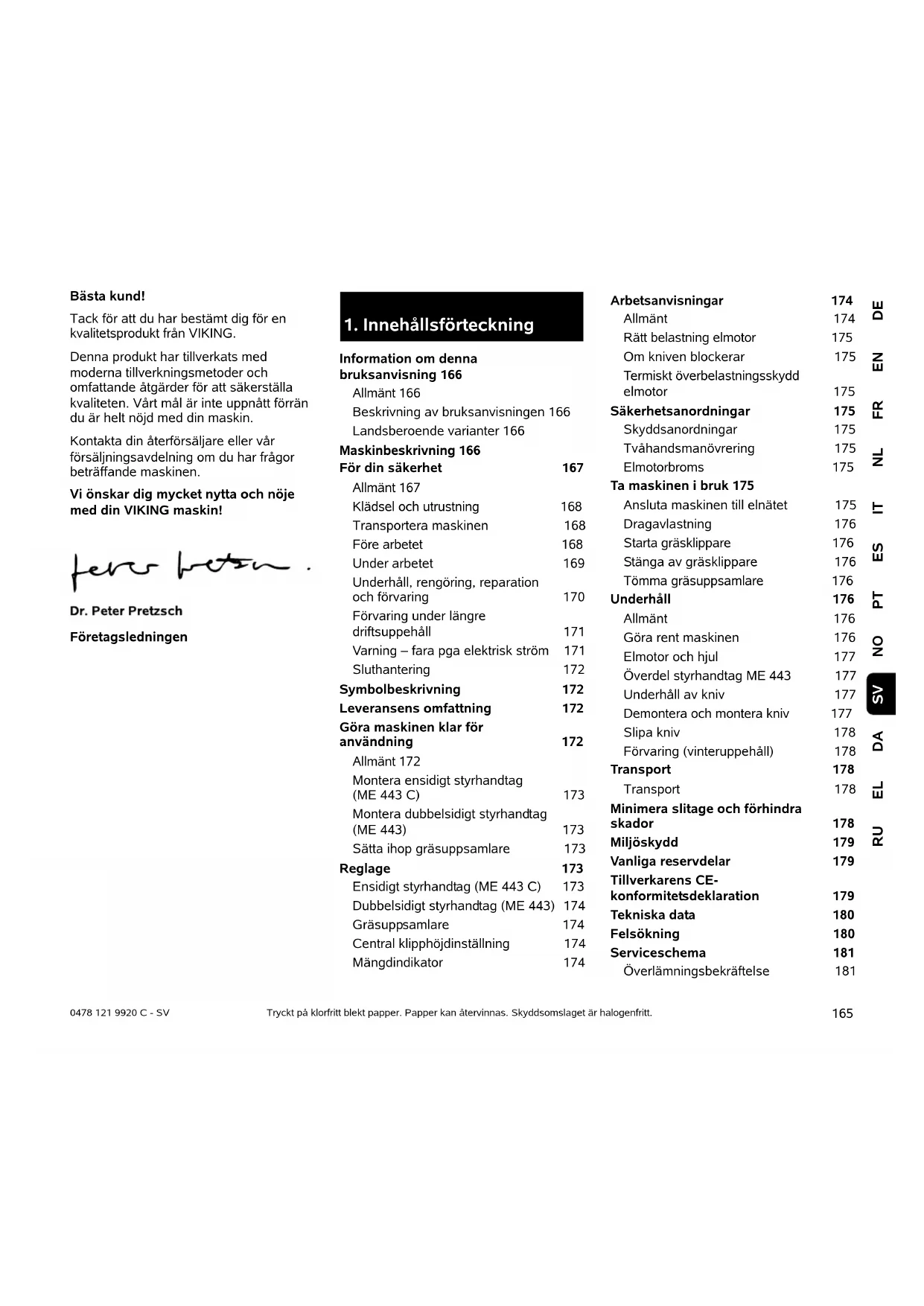 Information om denna bruksanvisning 166 Allmänt 166 Beskrivning av bruksanvisningen 166 Landsberoende varianter 166 Maskinbeskrivning 166 För din säkerhet 167 Allmänt 167 Klädsel och utrustning 168 Transportera maskinen 168 Före arbetet 168 Under arbetet 169 Underhåll, rengöring, reparation och förvaring 170 Förvaring under längre driftsuppehåll 171 Varning – fara pga elektrisk ström 171 Sluthantering 172 Symbolbeskrivning 172 Leveransens omfattning 172 Göra maskinen klar för användning 172 Allmänt 172 Montera ensidigt styrhandtag (ME 443 C) 173 Montera dubbelsidigt styrhandtag (ME 443) 173 Sätta ihop gräsuppsamlare 173 Reglage 173 Ensidigt styrhandtag (ME 443 C) 173 Dubbelsidigt styrhandtag (ME 443) 174 Gräsuppsamlare 174 Central klipphöjdinställning 174 Mängdindikator 174 Arbetsanvisningar 174 Allmänt 174 Rätt belastning elmotor 175 Om kniven blockerar 175 Termiskt överbelastningsskydd elmotor 175 Säkerhetsanordningar 175 Skyddsanordningar 175 Tvåhandsmanövrering 175 Elmotorbroms 175 Ta maskinen i bruk 175 Ansluta maskinen till elnätet 175 Dragavlastning 176 Starta gräsklippare 176 Stänga av gräsklippare 176 Tömma gräsuppsamlare 176 Underhåll 176 Allmänt 176 Göra rent maskinen 176 Elmotor och hjul 177 Överdel styrhandtag ME 443 177 Underhåll av kniv 177 Demontera och montera kniv 177 Slipa kniv 178 Förvaring (vinteruppehåll) 178 Transport 178 Transport 178 Minimera slitage och förhindra skador 178 Miljöskydd 179 Vanliga reservdelar 179 Tillverkarens CE- konformitetsdeklaration 179 Tekniska data 180 Felsökning 180 Serviceschema 181 Överlämningsbekräftelse 1810478 121 9920 C - SV